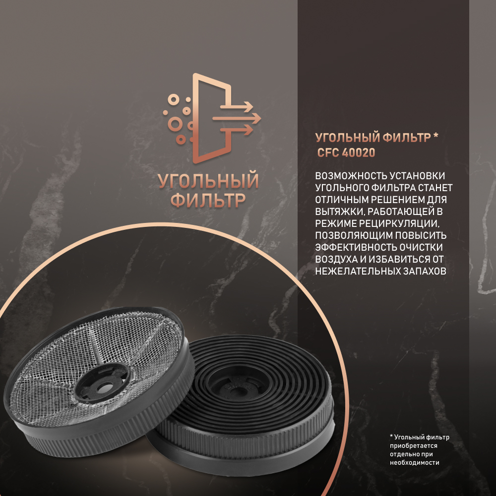 Возможность установки угольного фильтра станет отличным решением для вытяжки, работающей в режиме рециркуляции, позволяющим повысить эффективность очистки воздуха и избавиться от нежелательных запахов!