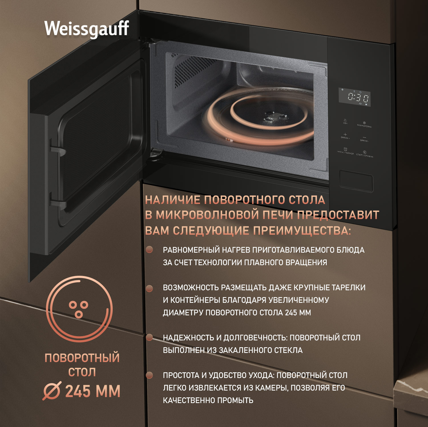 Встраиваемая микроволновая печь Weissgauff шириной 45 сантиметров, выполненная в чёрном закаленном стекле с сенсорной панелью управления, имеющая объем 20 литров - это настоящее воплощение основного принципа Weissgauff: "Качество, доступное каждому"