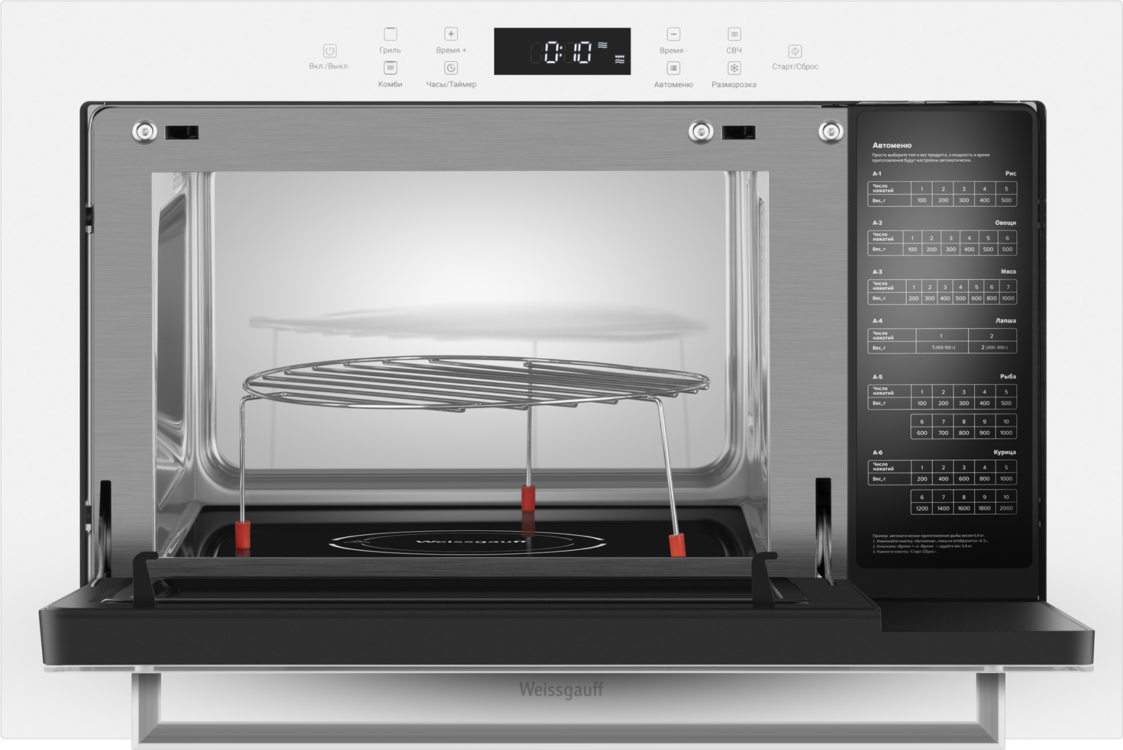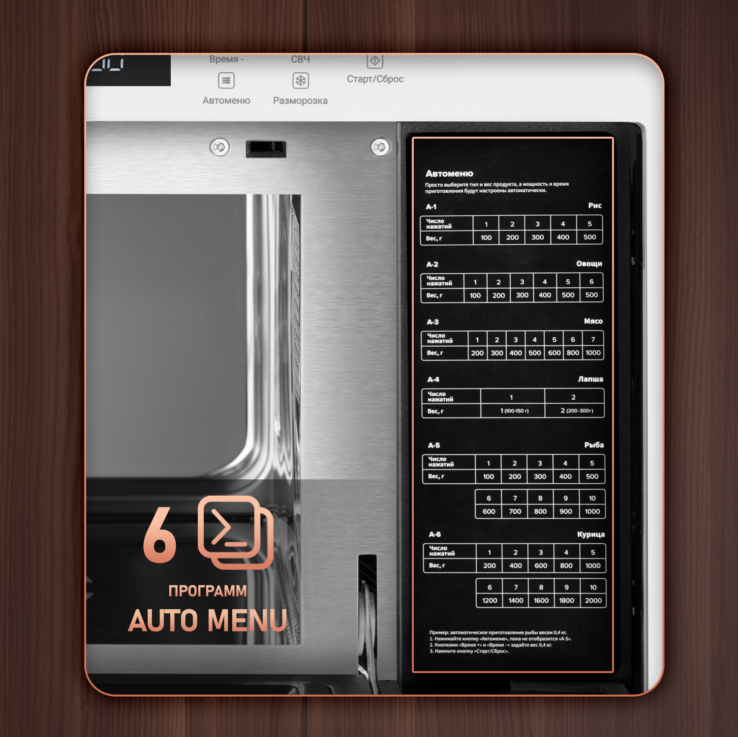 • 5 режимов мощности + автоменю на 6 программ открывает по-настоящему богатые возможности по настройке вашей микроволновой печи под требуемые особенности продуктов.