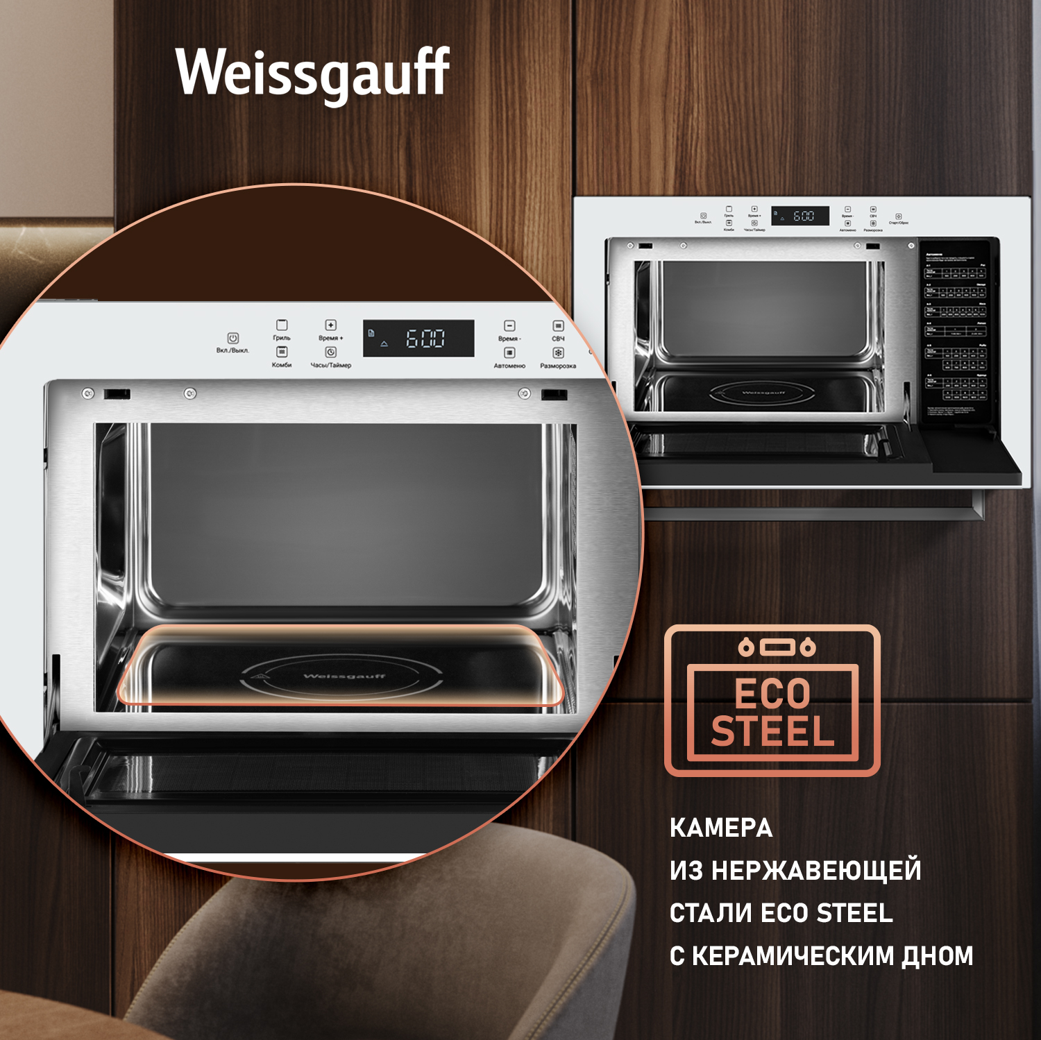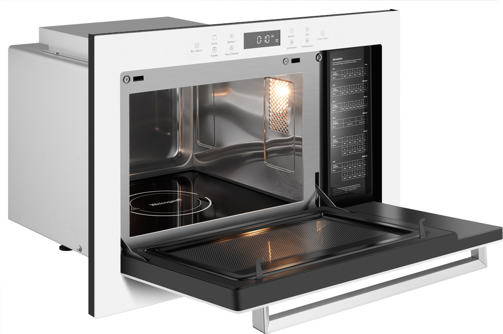 Встраиваемая микроволновая печь Weissgauff на 25 литров, выполненная в белом цвете, равномерно разогревает еду без поворотного стола, благодаря системе Spiegel и внутренней камере из нержавеющей стали облегчает процесс чистки, обеспечивает долговечность, устойчивость к царапинам и воздействию высоких температур, что обеспечивает лёгкость в уходе и долговечность.