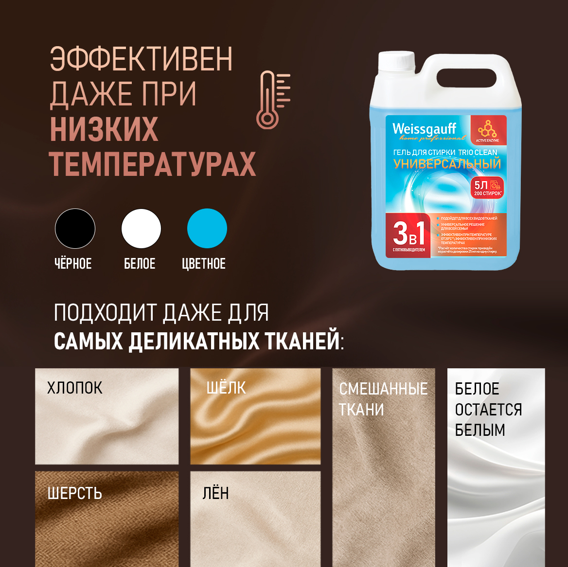 это универсальное средство для стирки, которое рекомендуют ведущие производители сочетает в себе энзимы, оптический пятновыводитель, комплекс ухода за тканями и представляет высокоэффективное средство для стирки и удаления широкого спектра загрязнений, включая пятна от косметических средств, чая, кофе, красного вина, томатного пюре, фруктовых соков, шоколада, крови, травы, грязи, соусов, жирных продуктов и солнцезащитных кремов. Средство сохраняет свою эффективность при эксплуатации в условиях пониженных температур, подходит для стирки деликатных тканей, включая детское белье, и рассчитано на 200 циклов стирки.