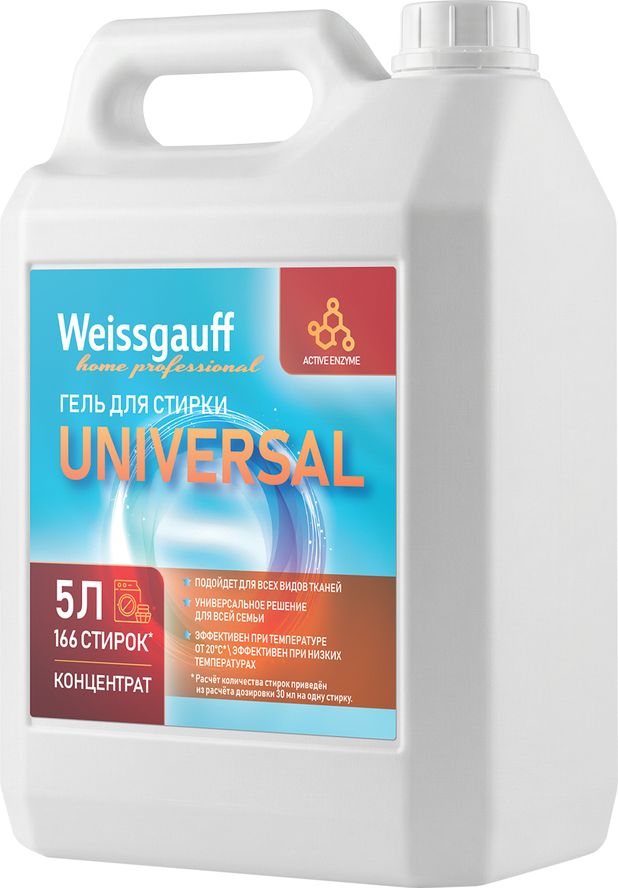 Гель-концентрат для стирки всех видов тканей Weissgauff Universal объемом 5 литров — для стирки изделий из разнообразных текстильных материалов, включая хлопчатобумажные, льняные, синтетические ткани и ткани из смешанных волокон, при этом исключая шерстяные и шелковые изделия. Совместимо с использованием в стиральных машинах любого типа, а также подходит для ручной стирки в воде различной жесткости.