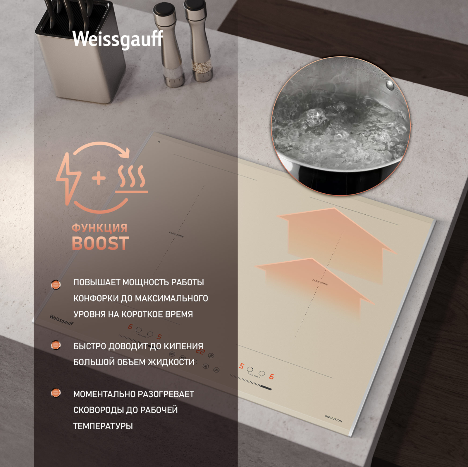 Опция Boost это удобная функция, позволяющая направить весь потенциал индукционной панели в одну рабочую зону и, тем самым, значительно увеличить эффективность и скорость нагрева.
