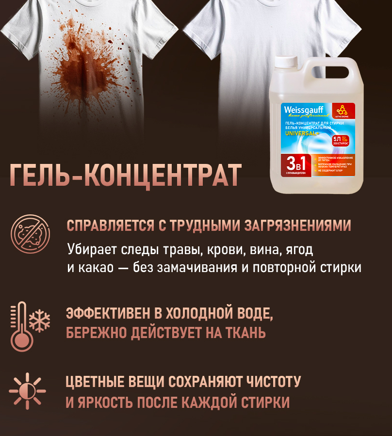 это универсальное средство для стирки, которое рекомендуют ведущие производители. Оно содержит энзимы, оптический пятновыводитель и комплекс для ухода за тканями. Благодаря этому оно эффективно удаляет широкий спектр загрязнений с натуральных и синтетических тканей. Средство справляется с пятнами от косметики, чая, кофе, красного вина, томатного пюре, фруктовых соков, шоколада, крови, травы, грязи, соусов, жирных продуктов и солнцезащитных кремов. Активные поверхностно-активные вещества сохраняют его эффективность даже при низких температурах. Оно подходит для стирки деликатных тканей, включая детское бельё, и рассчитано на 200 стирок.