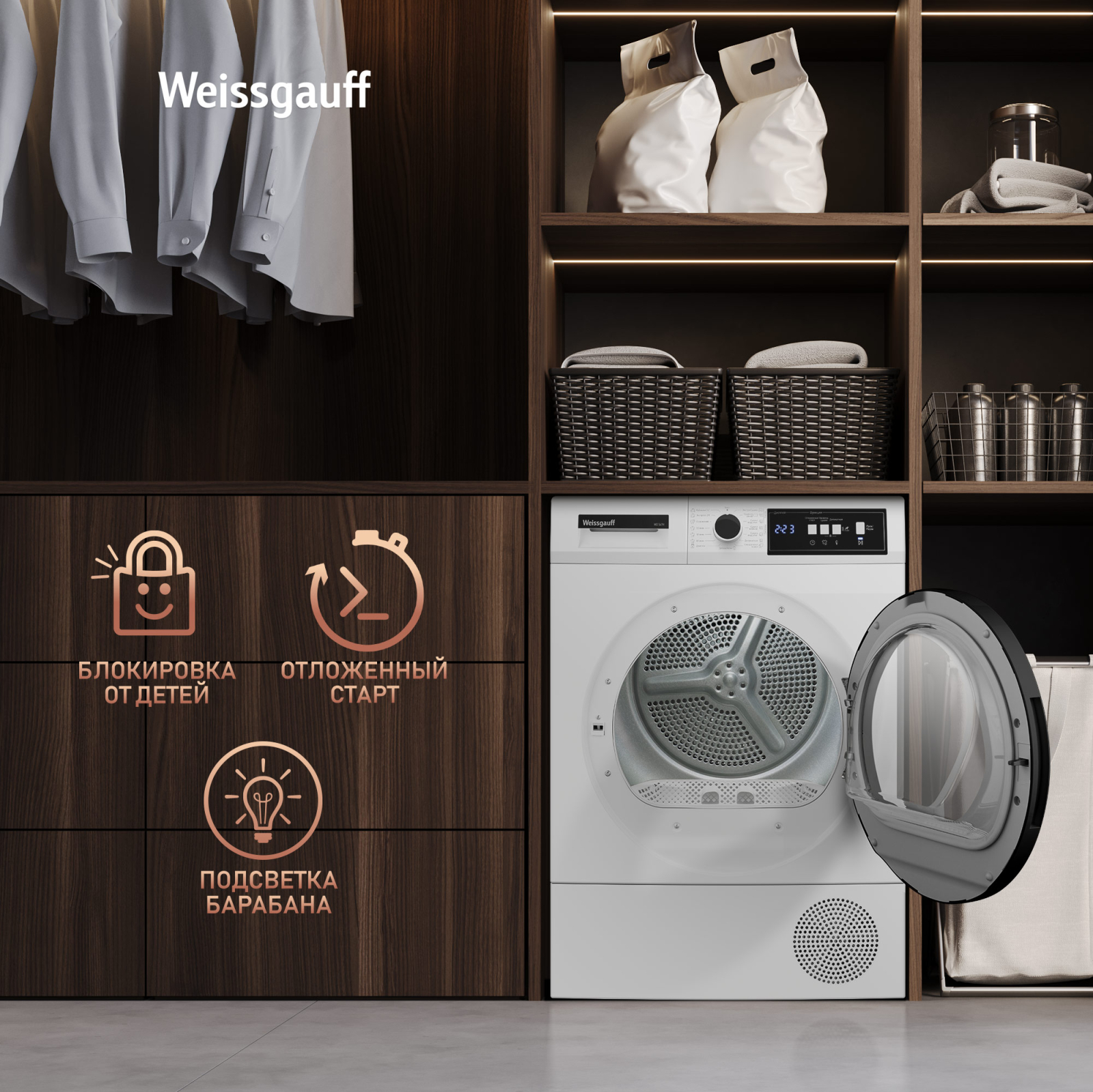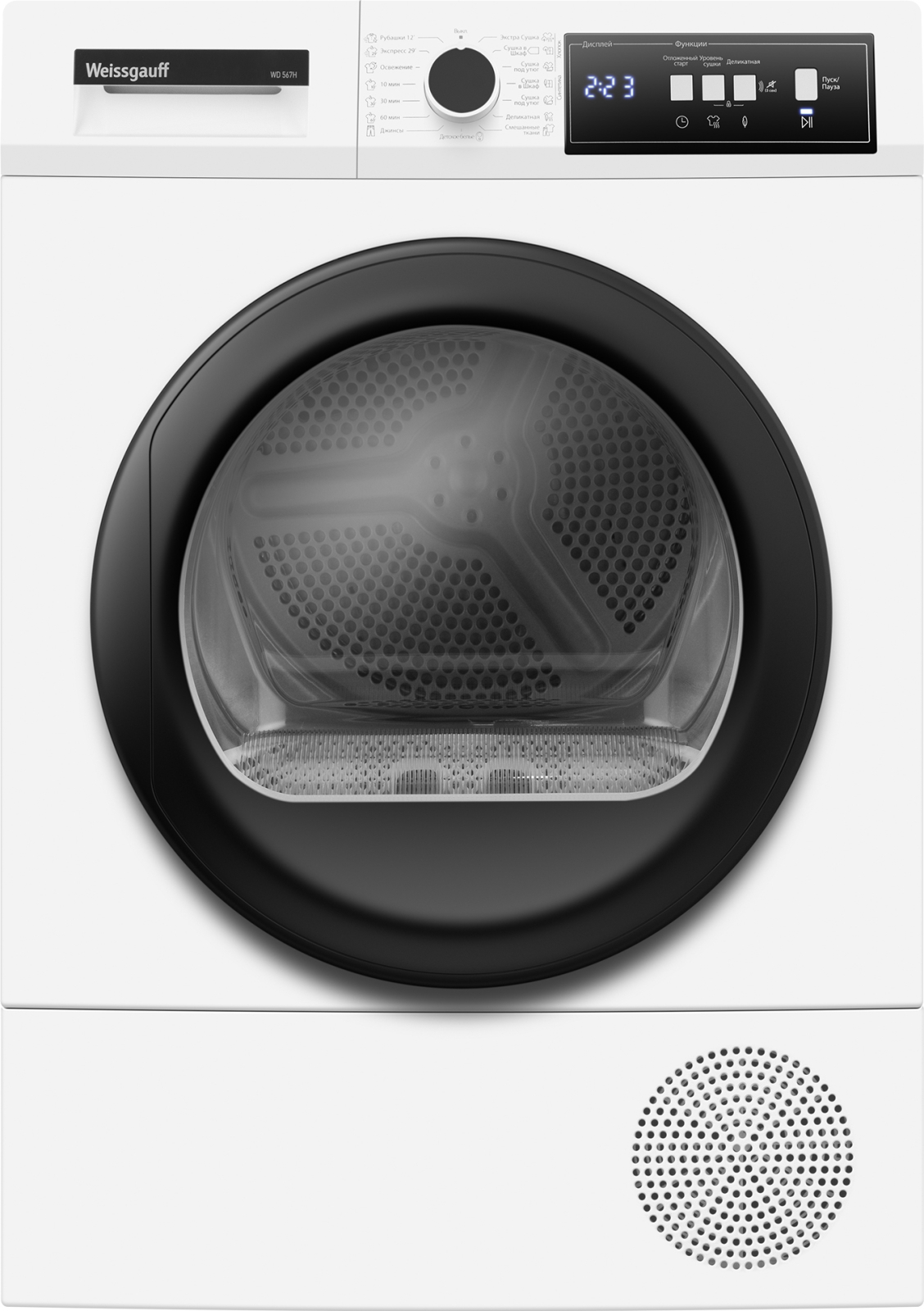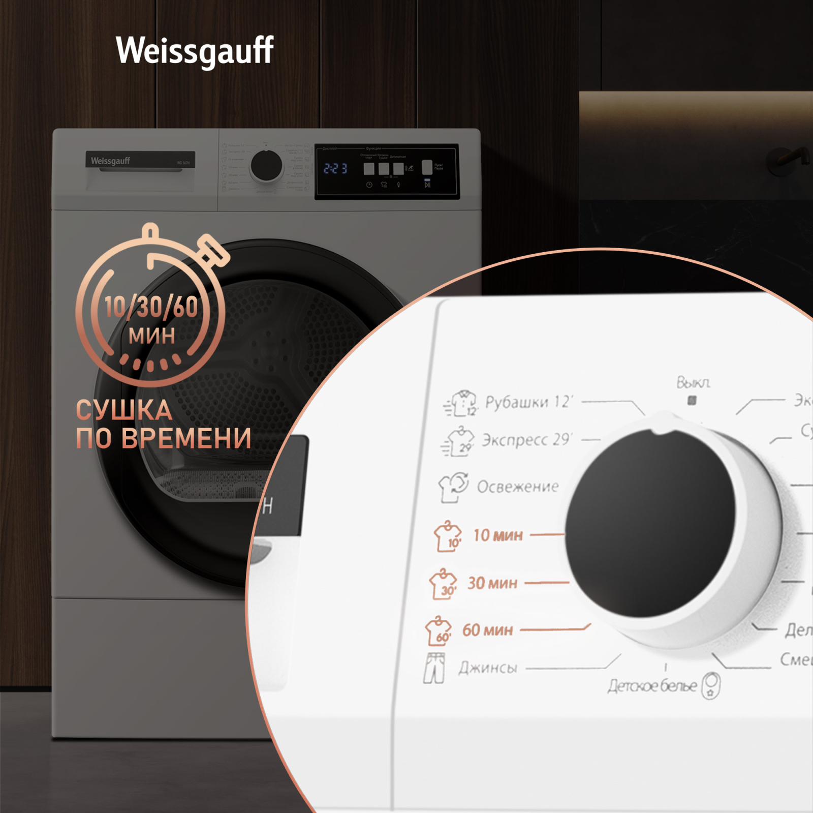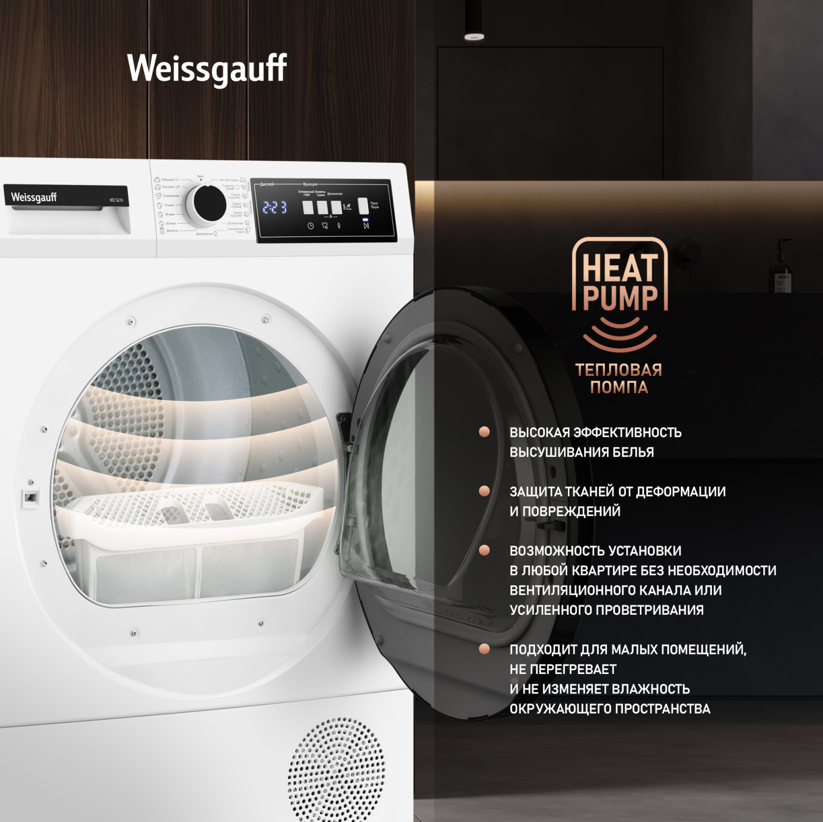 Отдельностоящая сушильная машина Weissgauff, оснащенная тепловой помпой, имеющая впечатляющий показатель загрузки до 7 килограммов белья, и полностью электронное управление, станет для вас гарантией непревзойденной эффективности и высокого результата при каждом запуске этой великолепной модели!