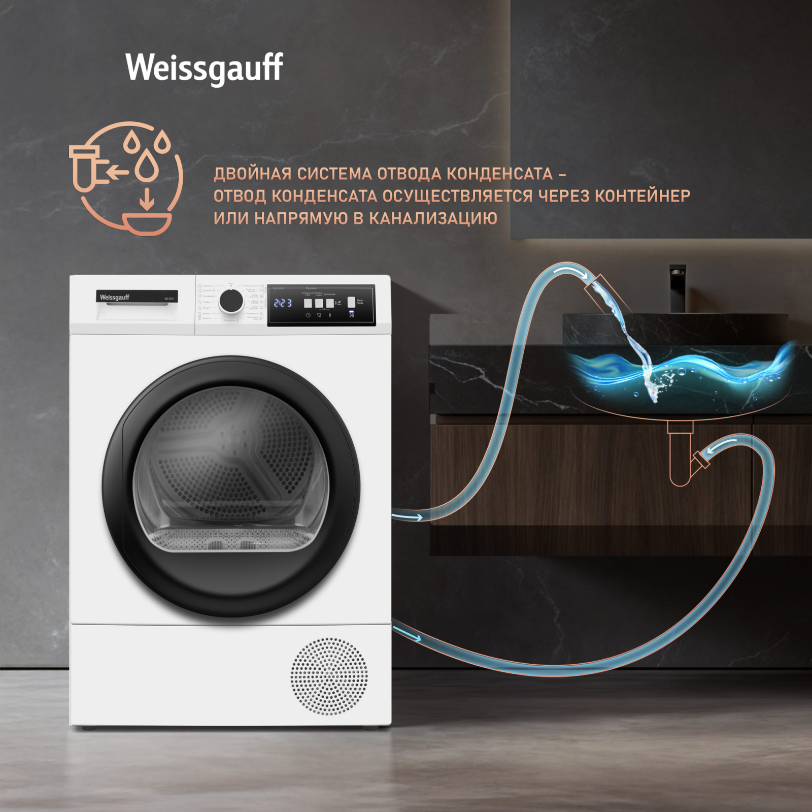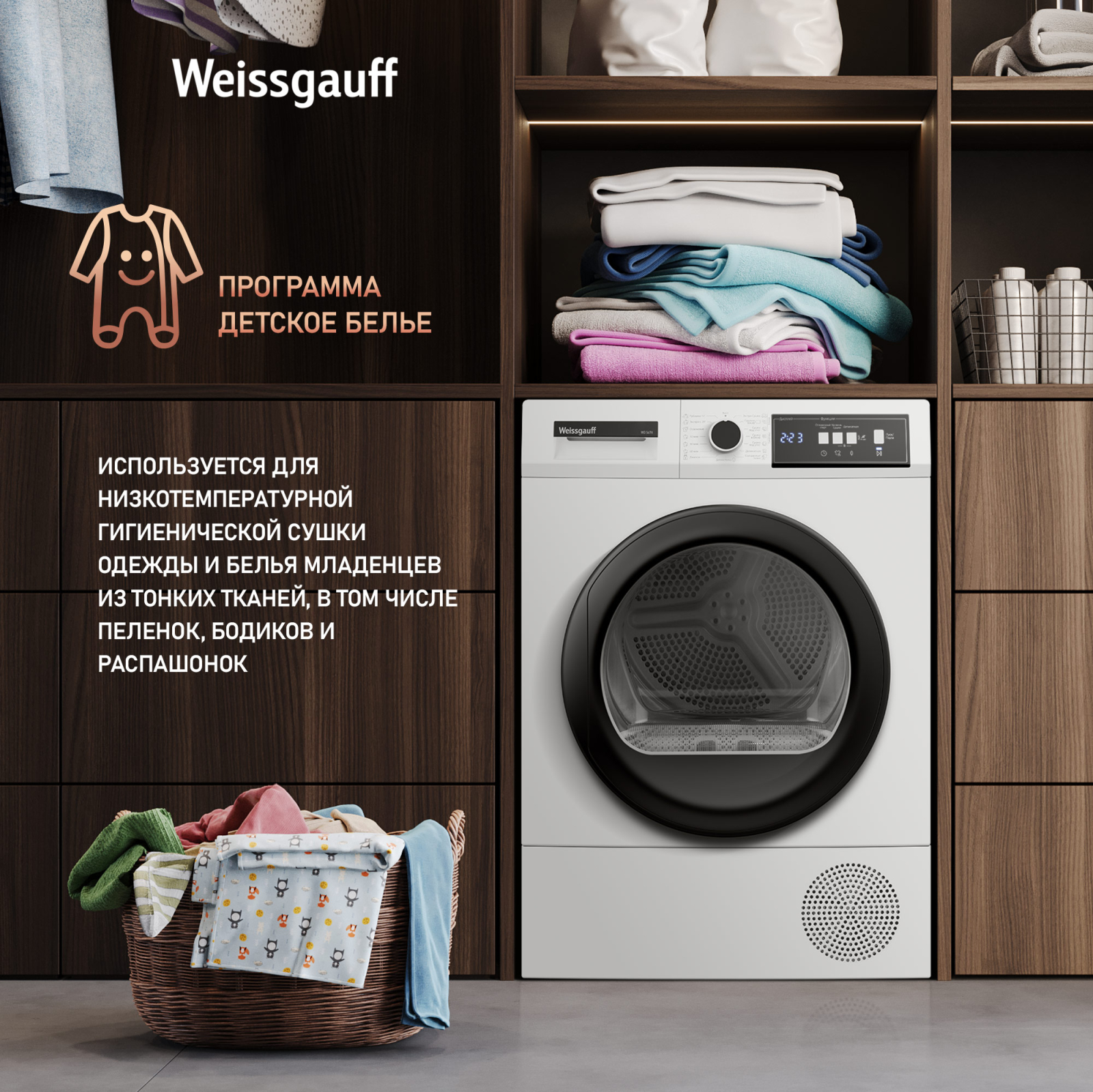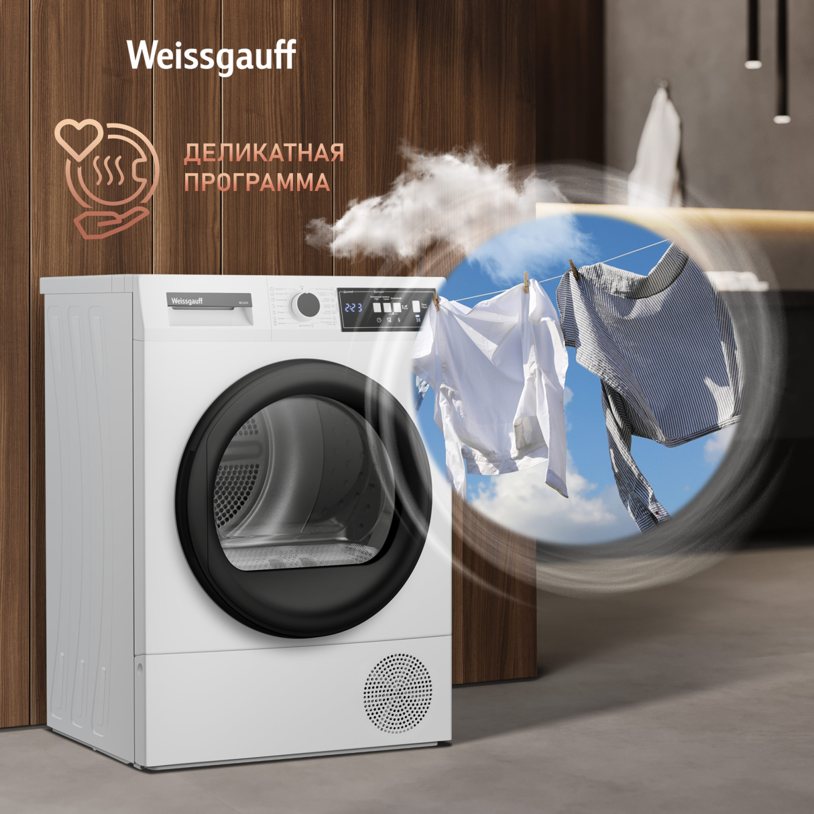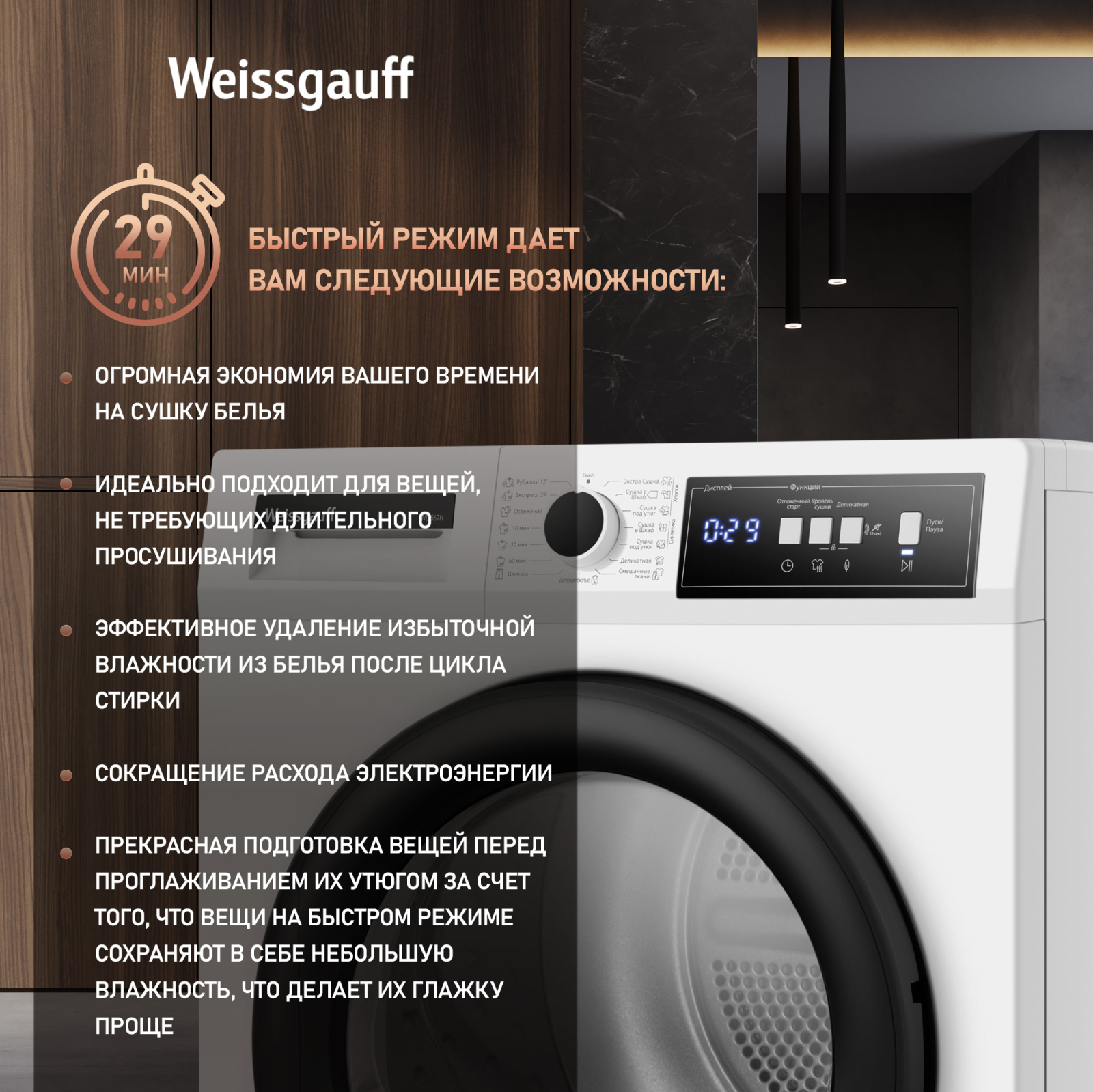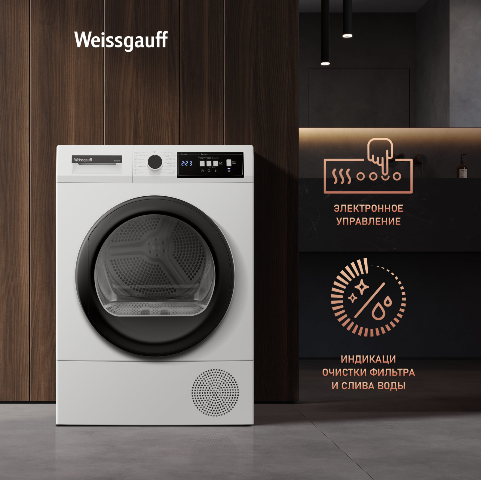 Отдельностоящая сушильная машина Weissgauff, оснащенная тепловой помпой, имеющая впечатляющий показатель загрузки до 7 килограммов белья, и полностью электронное управление, станет для вас гарантией непревзойденной эффективности и высокого результата при каждом запуске этой великолепной модели!