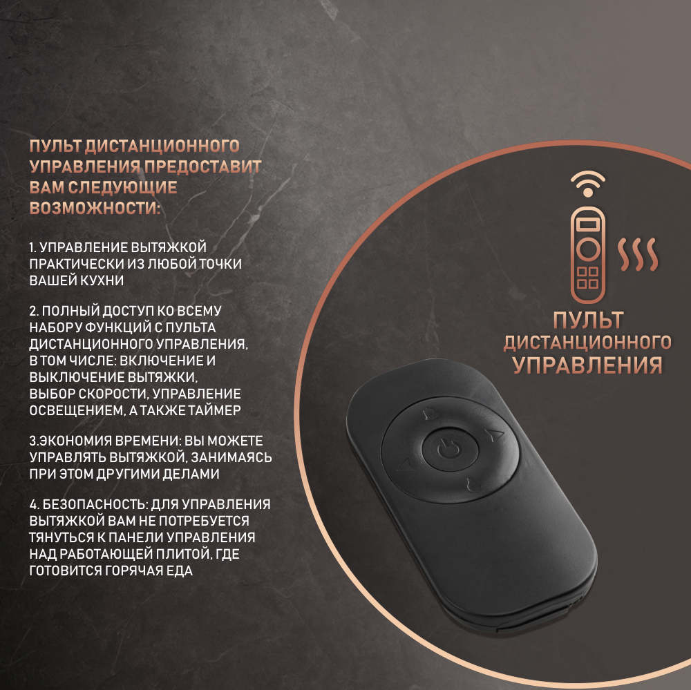 Пульт дистанционного управления обеспечит вам доступ к управлению вытяжкой из любой точки кухни, позволяя включить устройство, выбрать скорость, активировать таймер или включить освещение!