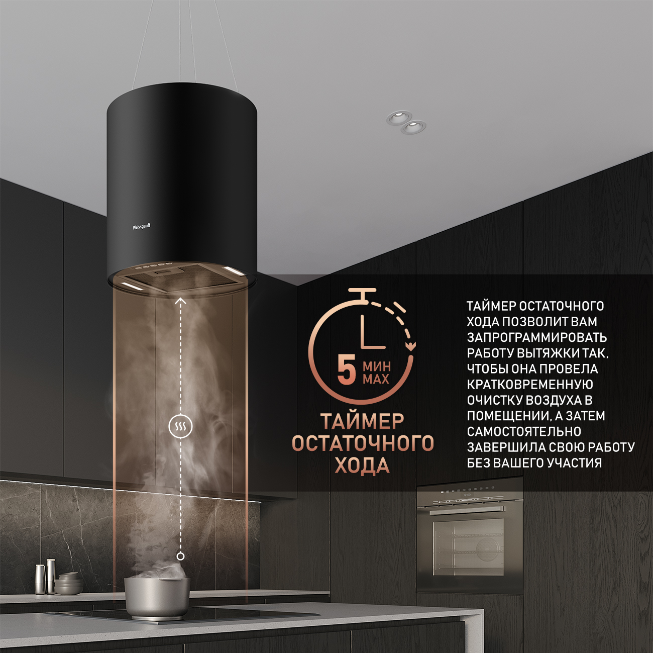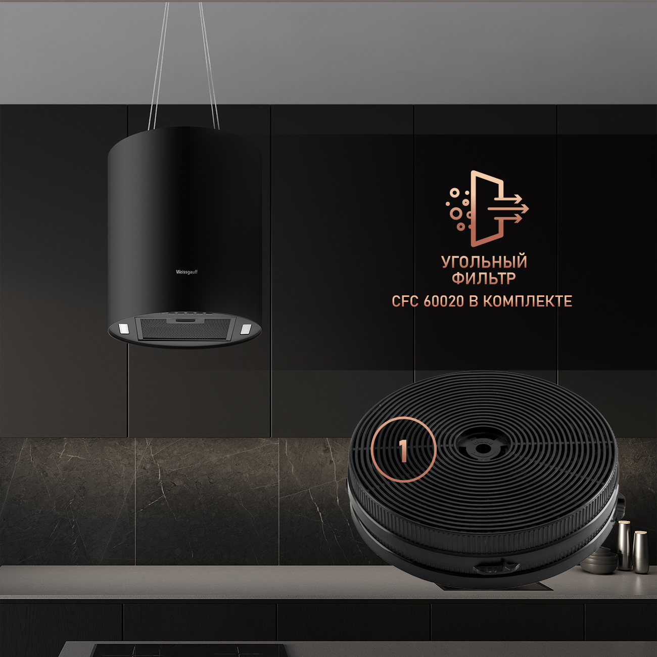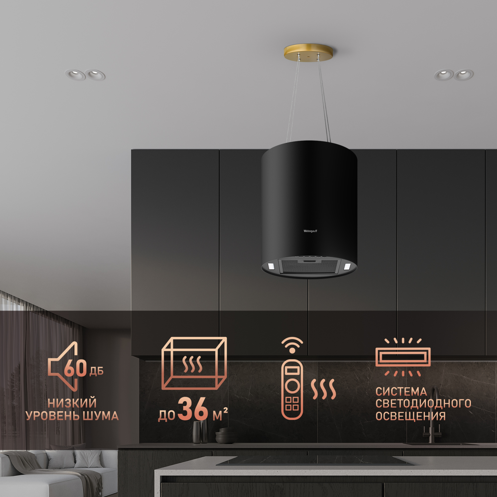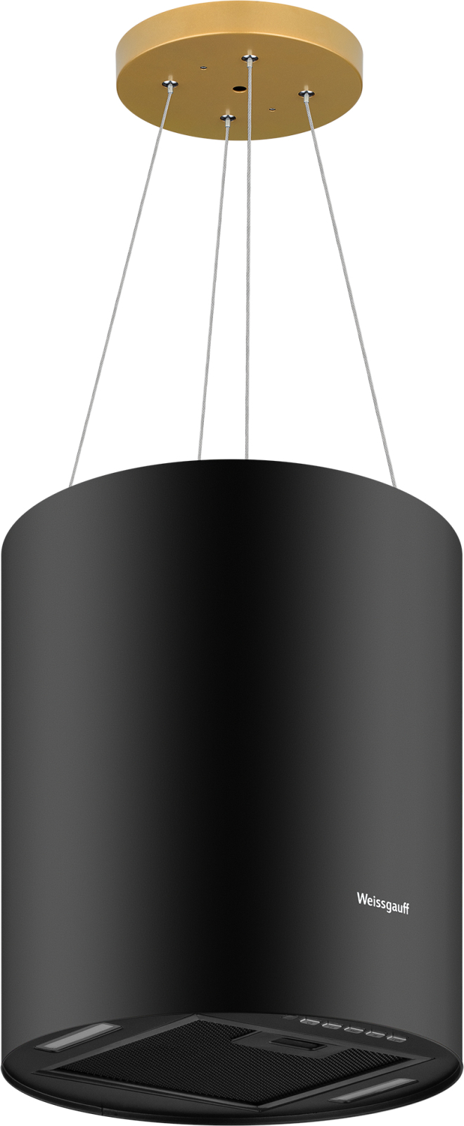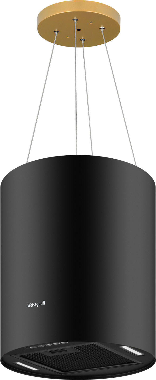 Островная вытяжка от Weissgauff с креплением на тросах, выполненная в черном цвете, обладающая уверенной производительностью до 1200 м3/ч при довольно низком уровне шума, оснащенная удобным и чувствительным кнопочным управлением, не только порадует своей эффективностью, но и станет настоящим украшением вашей кухни!