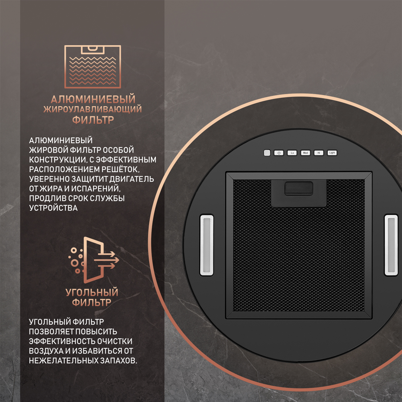 Алюминиевый жировой фильтр особой конструкции, с эффективным расположением фильтрующих решёток, уверенно защитит двигатель от жира и испарений, продлив срок службы устройства.