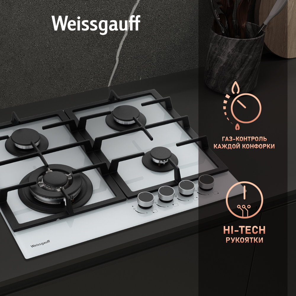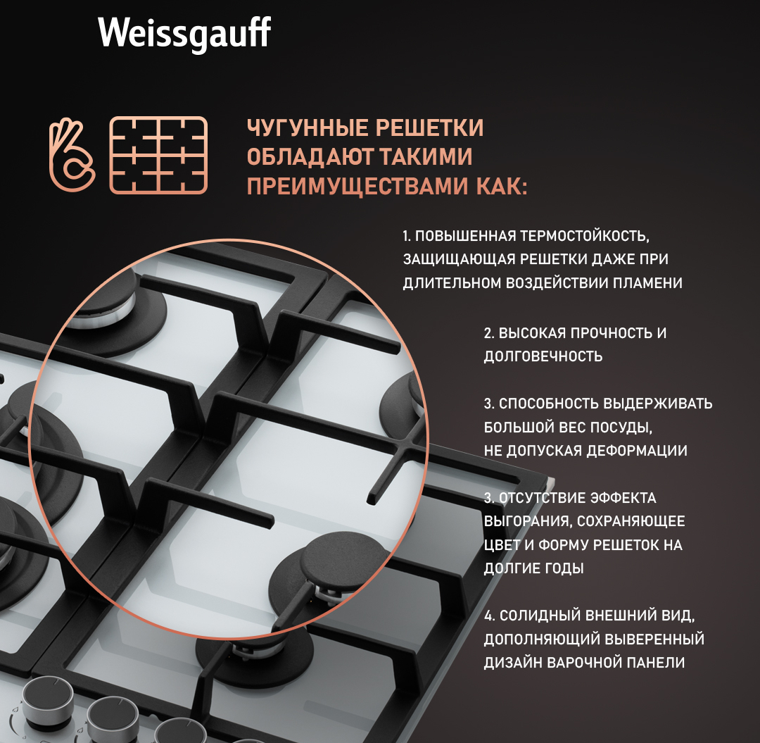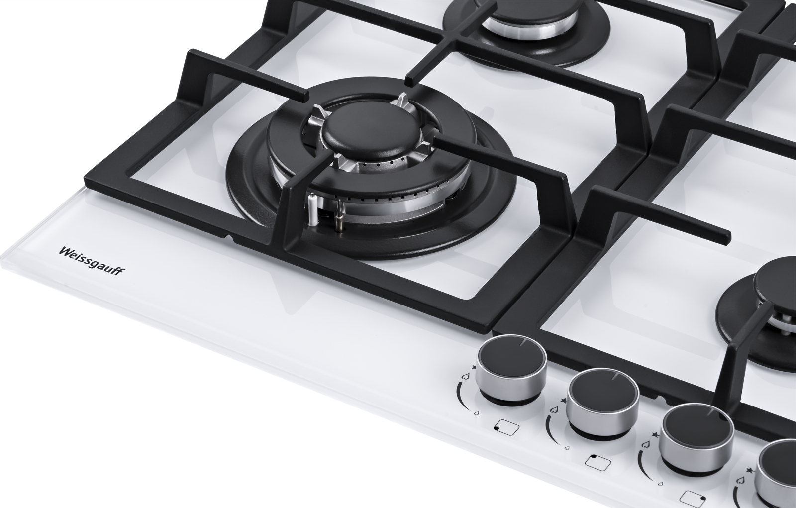 Варочная панель Weissgauff, оснащённая рукоятками с подсветкой и современными решетками из высококачественного чугуна - это поистине современная и функциональная модель Weissgauff, исполненная в белом закалённом стекле
