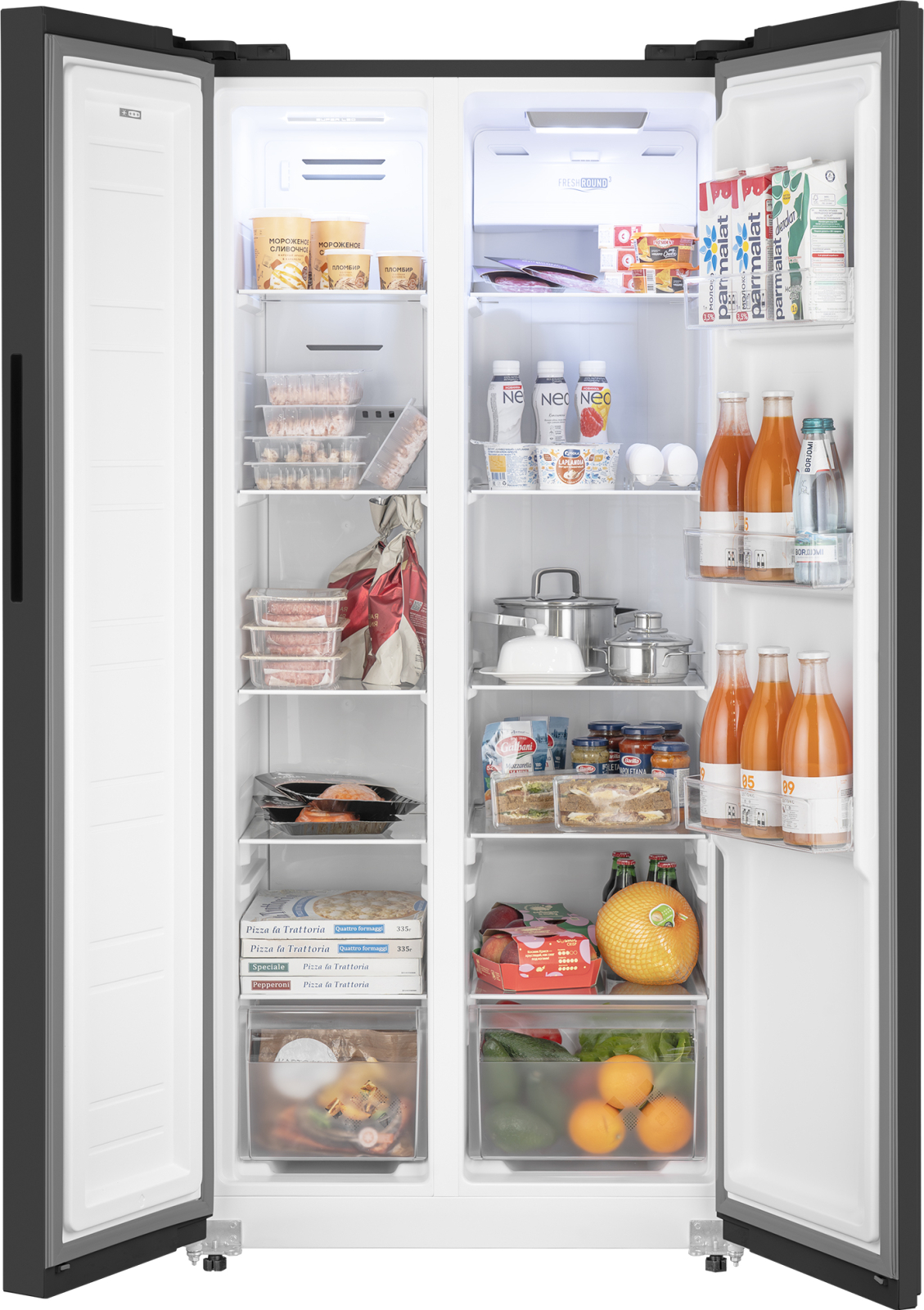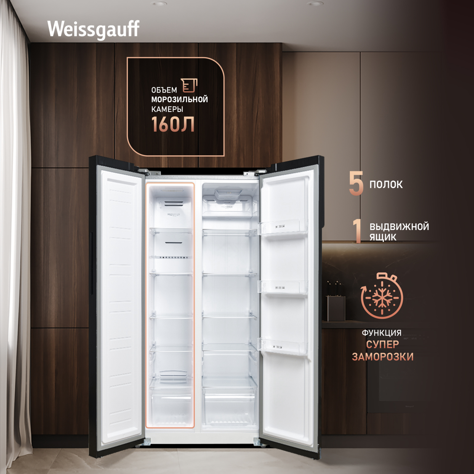 Отдельностоящий холодильник Weissgauff, выполненный в современном европейском дизайне Side-by-Side в черном цвете, обладающий полной системой размораживания Full No Frost и полностью электронным управлением - это соотношение фантастической вместительности, безупречной эргономики внутреннего пространства, технологического совершенства и великолепного дизайна!