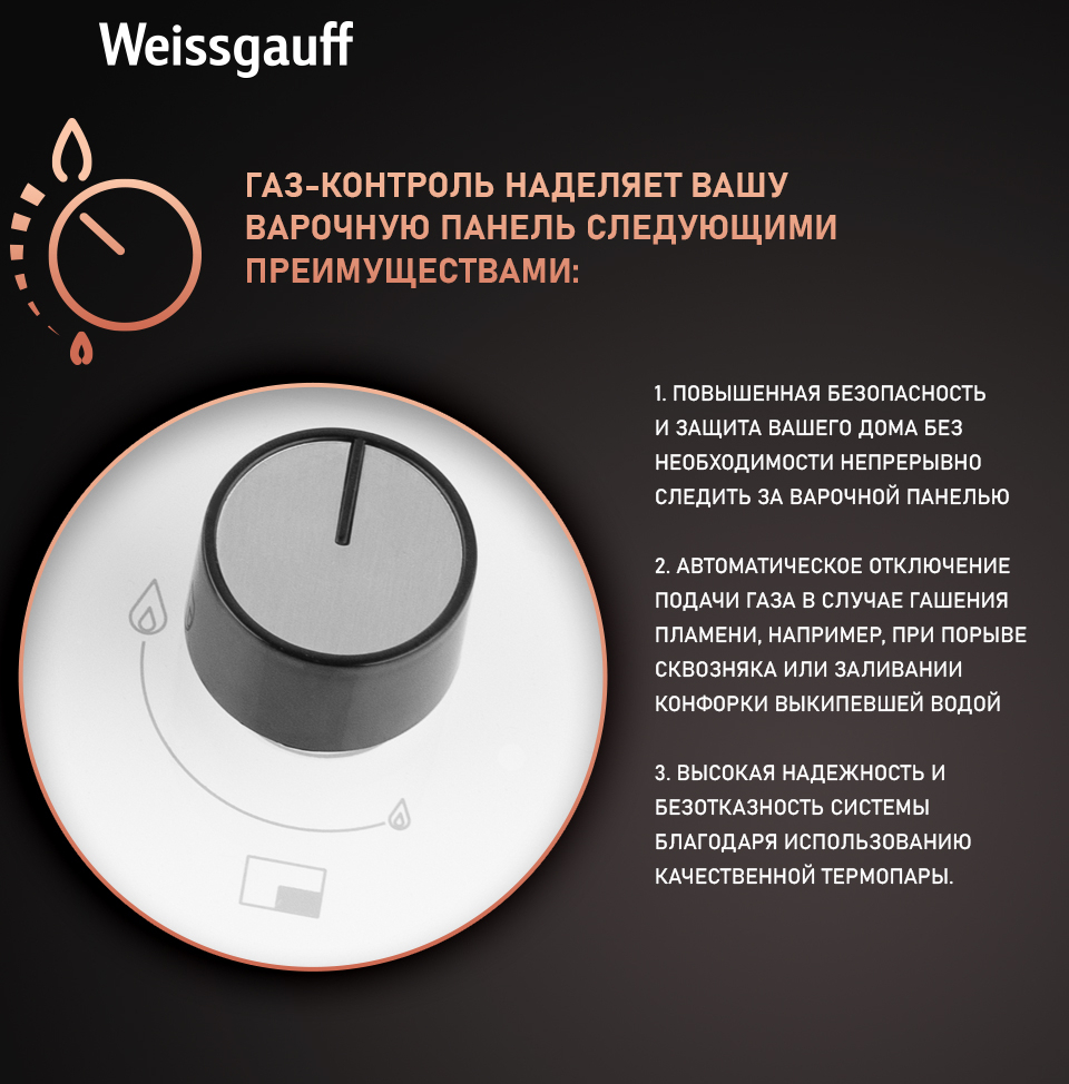 Газ-контроль каждой конфорки обеспечивает наивысшую безопасность: в случае, если пламя погасло, подача газа будет автоматически прекращена!