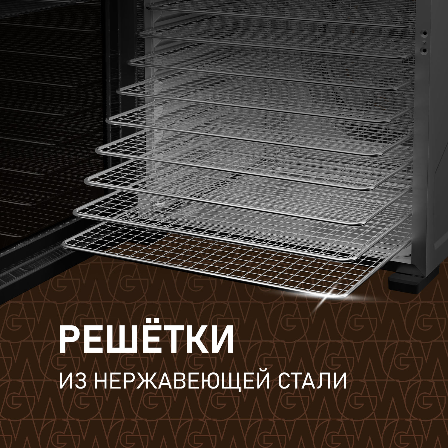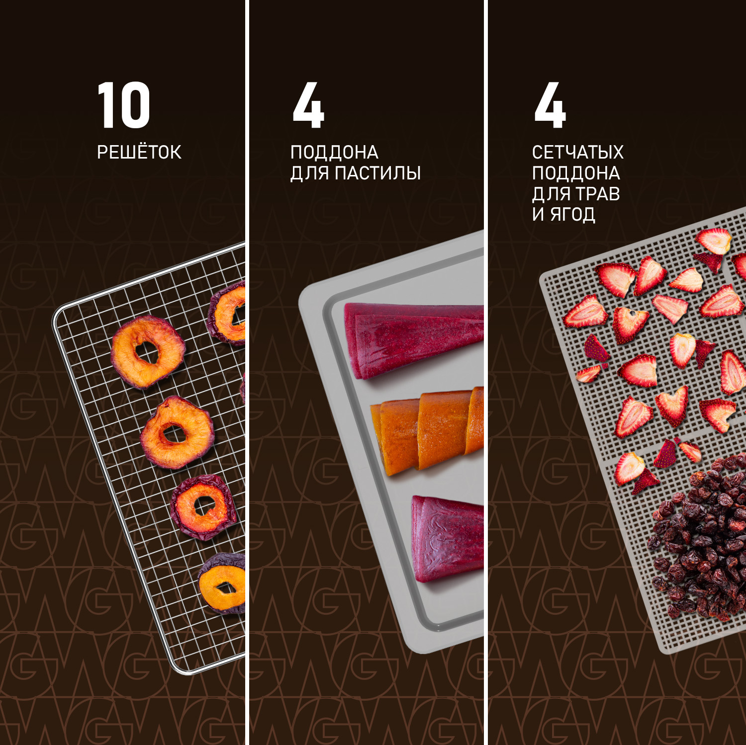 • Богатая комплектация устройства включает в себя - 10 решеток для овощей и фруктов, 4 поддона пастилы и 4 сетки трав — всё, что нужно для приготовления вашего любимого продукта!