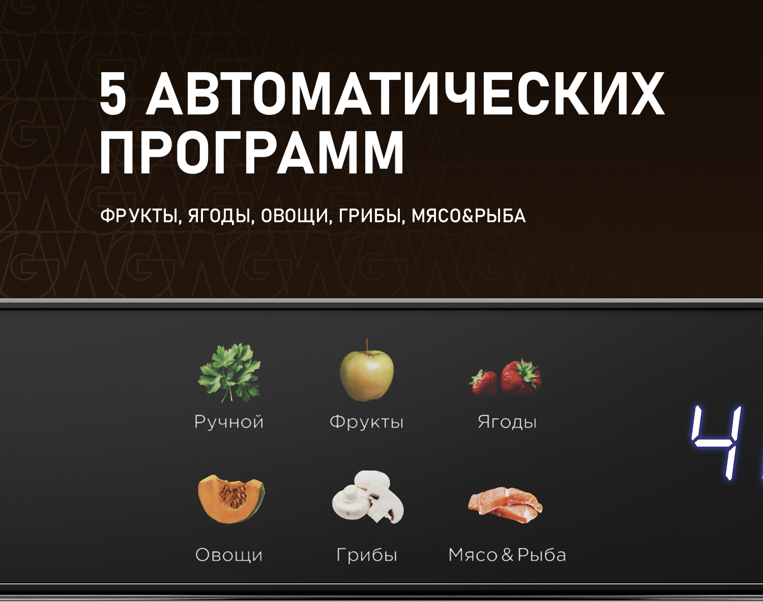 • 5 автоматических программ и возможность вручную устанавливать температуру в диапазоне от 35 °C до 75 °C. Вы сможете приготовить идеально высушенные и вяленые фрукты, ягоды, овощи, грибы, мясо, рыбу более удобным и точным способом и при этом достичь превосходного результата.