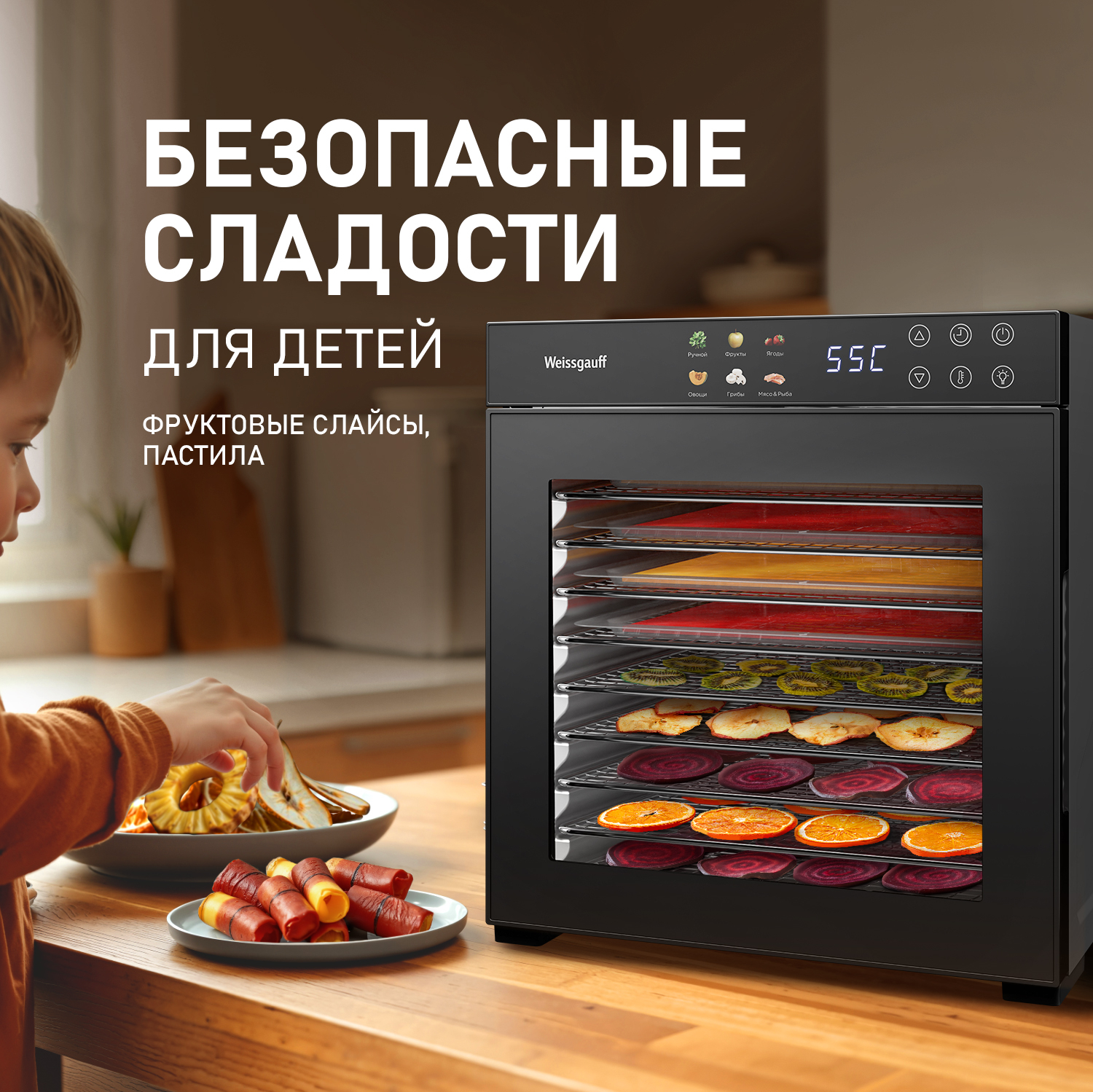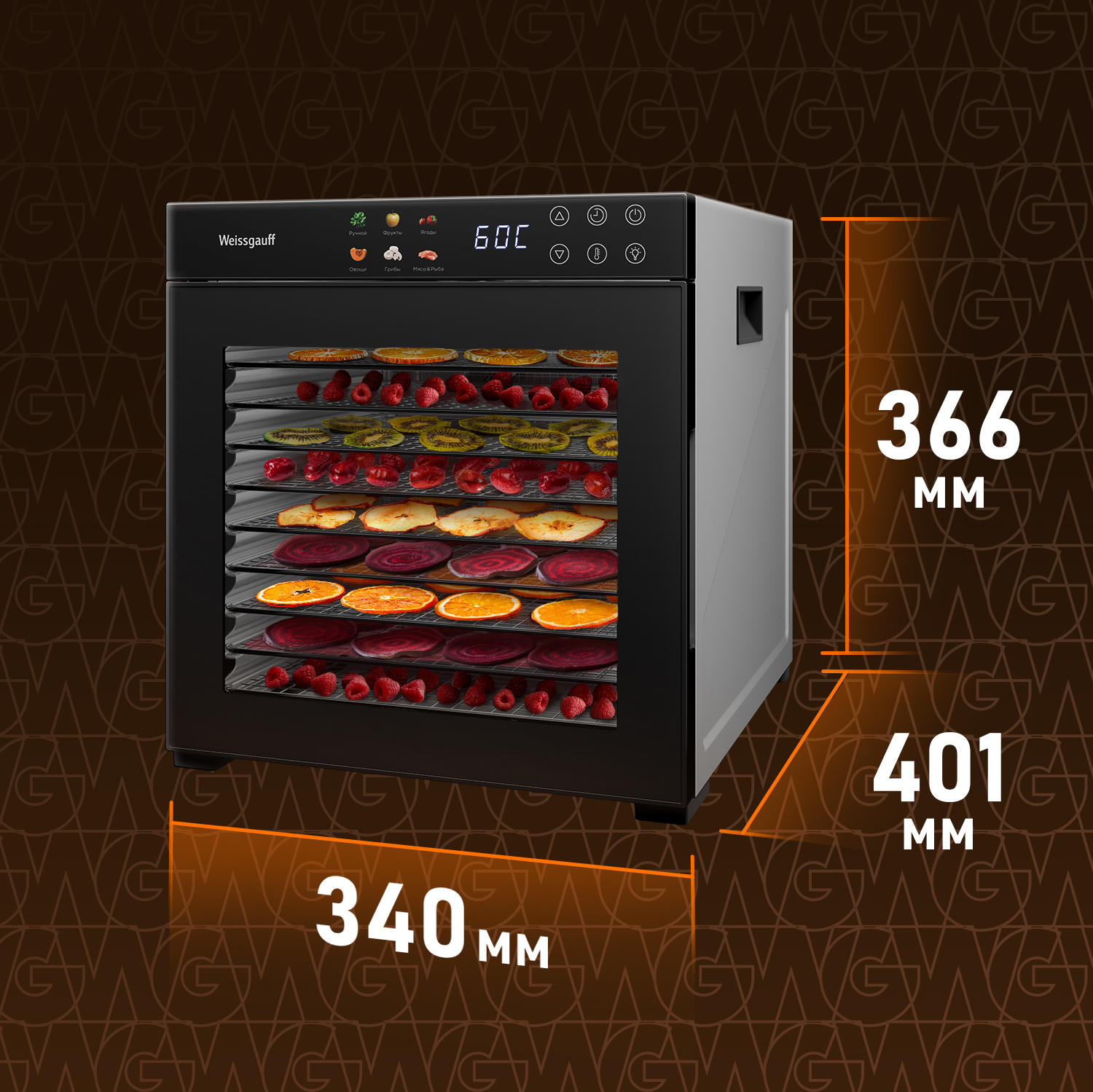Дегидратор от Weissgauff -это инновационное решение для вашей кухни, открывающее новые горизонты в процессе обезвоживания продуктов растительного и животного происхождения. С его помощью вы сможете создавать разнообразные продукты: овощные и фруктовые чипсы, хлебцы, пастилу, а также сушёное и вяленое мясо и рыбу. Современный и стильный дизайн устройства станет украшением любой кухни. Его компактные размеры, объём 25 литров и мощность 1000 Вт позволяют разместить его в любом уголке кухни.