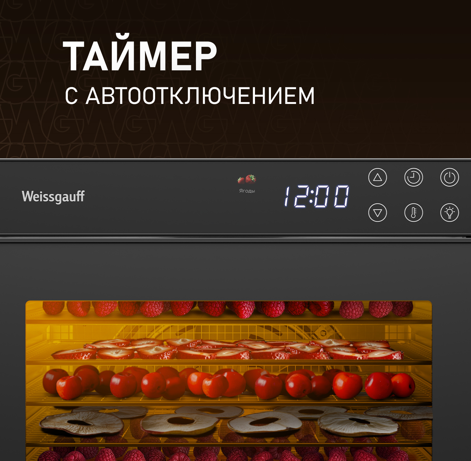 • Внутренняя подсветка, мягкое кристально чистое освещение позволит вам оценить качество сушки продуктов сразу после открытия дверцы.