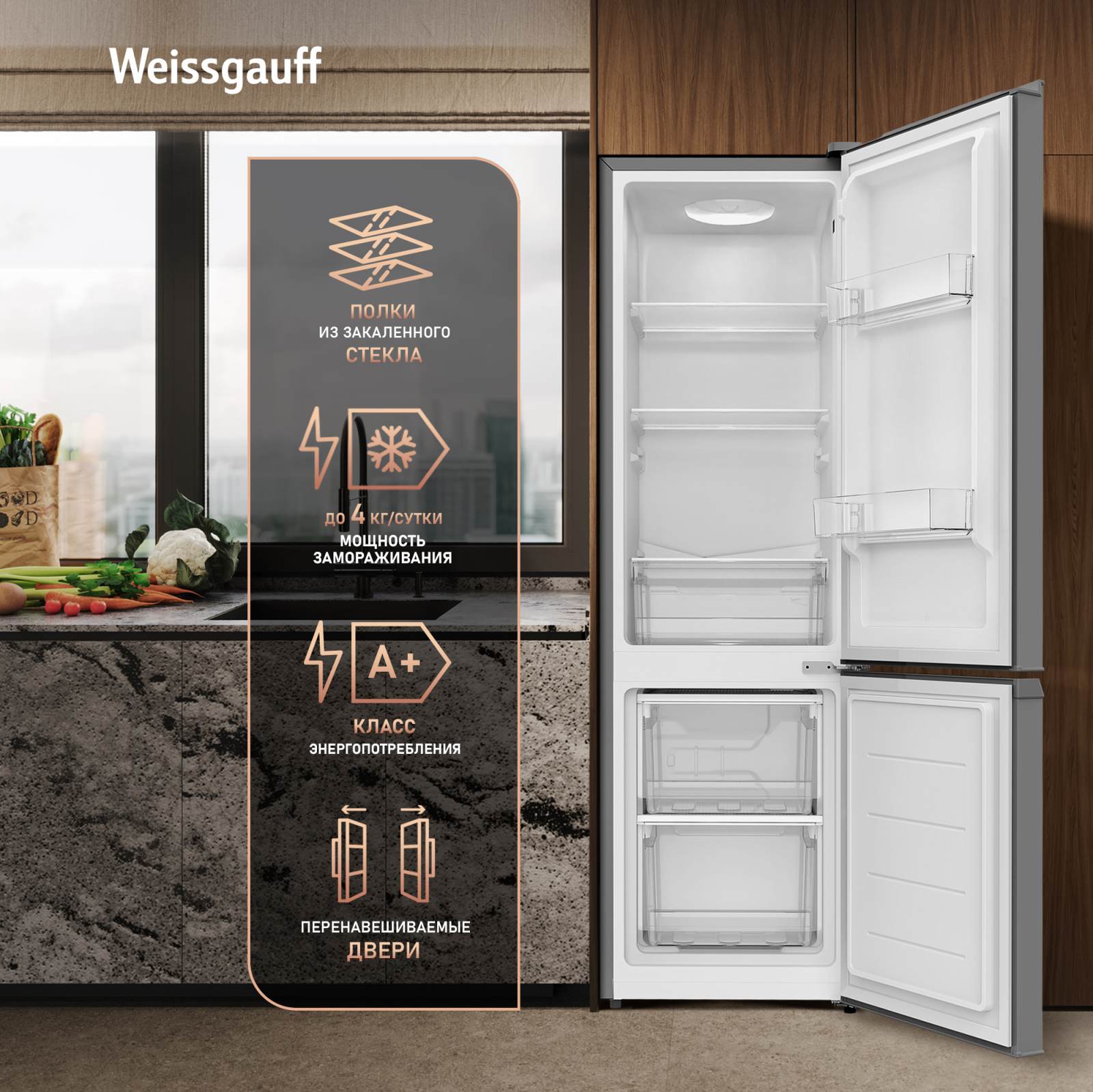 Отдельностоящий холодильник Weissgauff выполненный в цвете нержавеющая сталь, обладающий компактными размерами и фантастической вместительностью - это соотношение превосходной эргономики внутреннего пространства, технологического совершенства и великолепия внешнего дизайна!