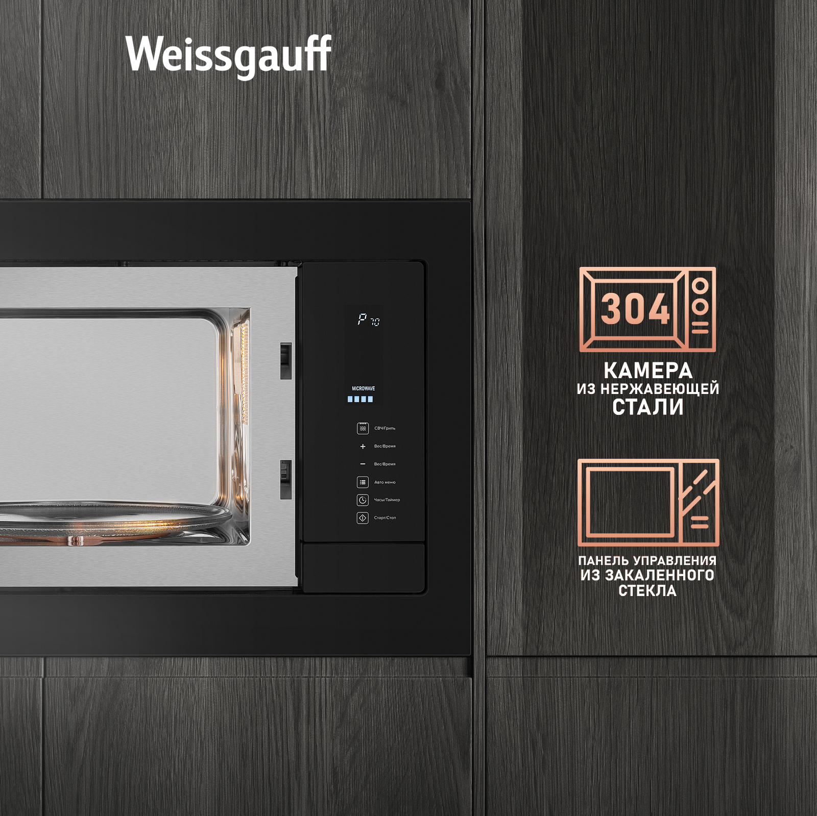 Встраиваемая микроволновая печь Weissgauff с объемом 25 литров, выполненная в черном цвете, равномерно разогревает еду при помощи поворотного стола, а также оснащена грилем с возможностью работы в комбинированном режиме и набором программ автоменю!