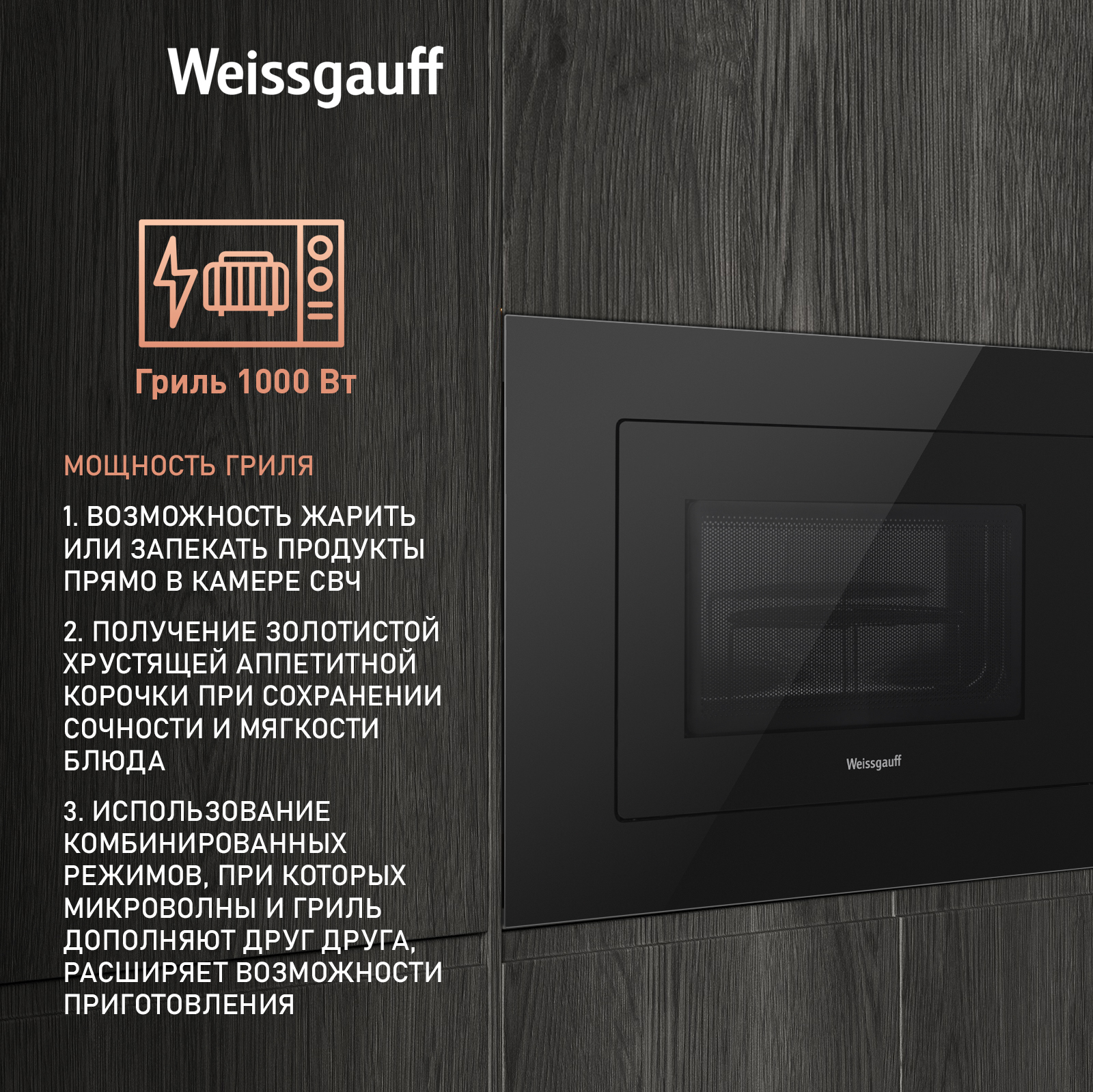 Встраиваемая микроволновая печь Weissgauff с объемом 25 литров, выполненная в черном цвете, равномерно разогревает еду при помощи поворотного стола, а также оснащена грилем с возможностью работы в комбинированном режиме и набором программ автоменю!