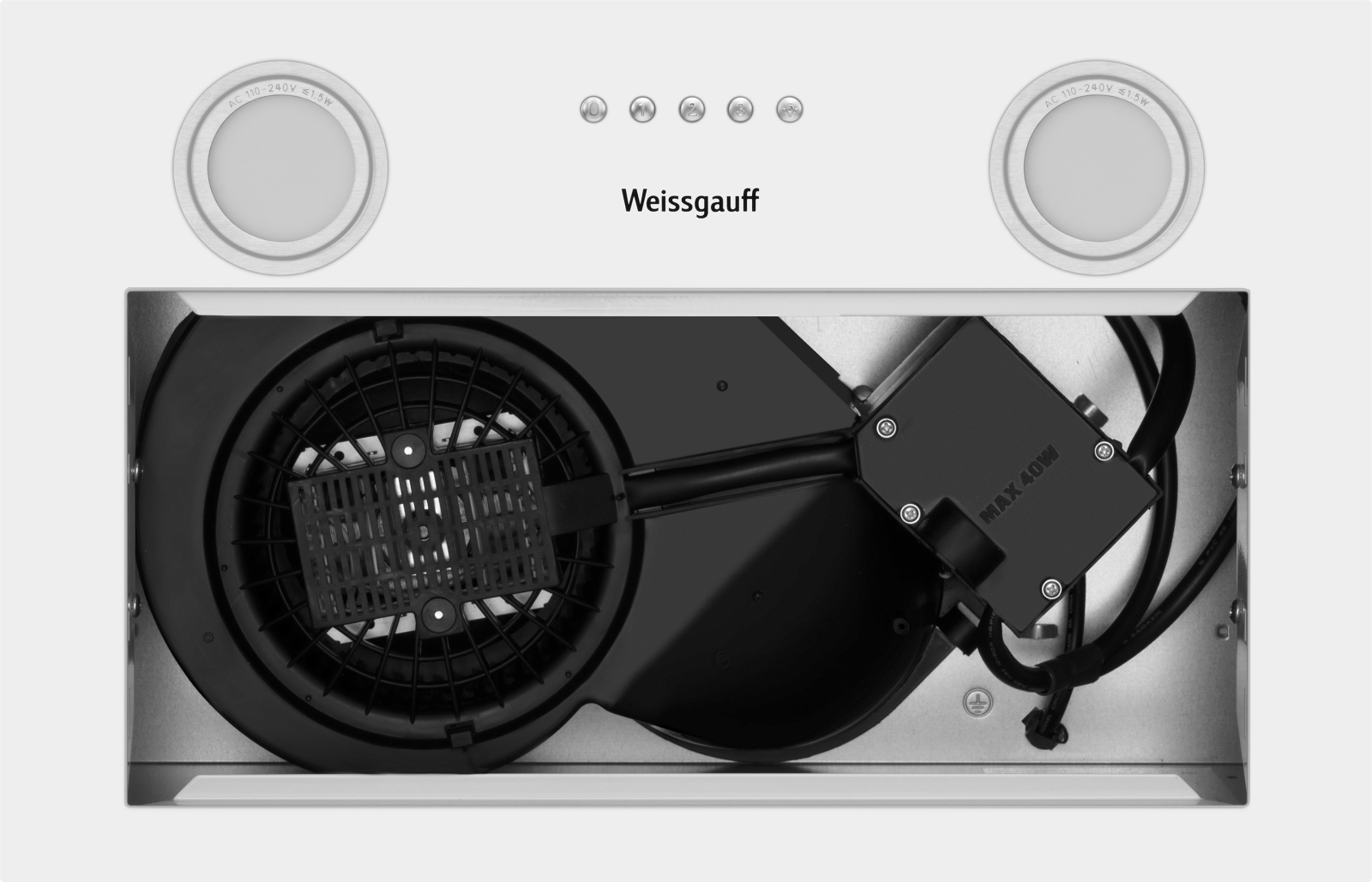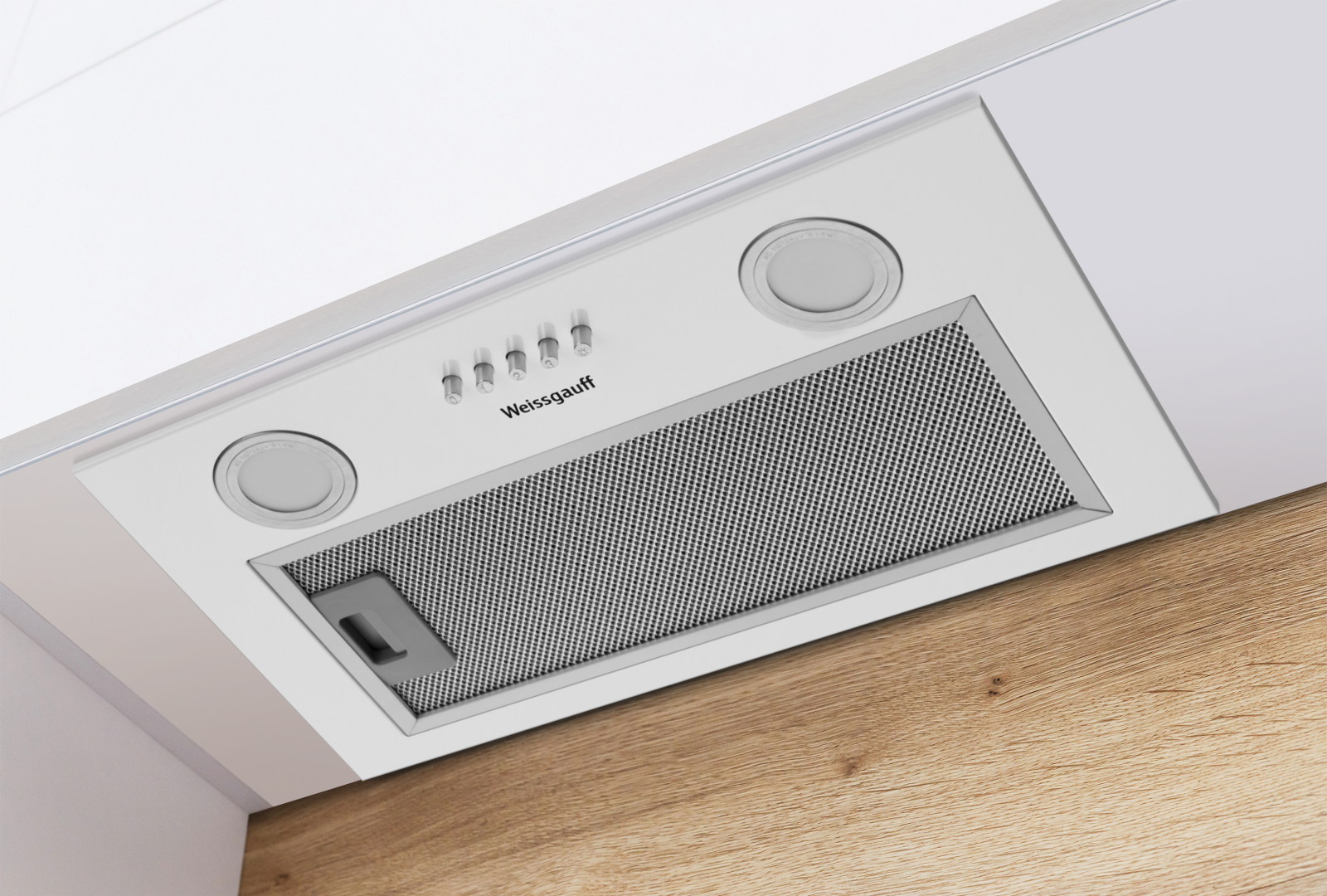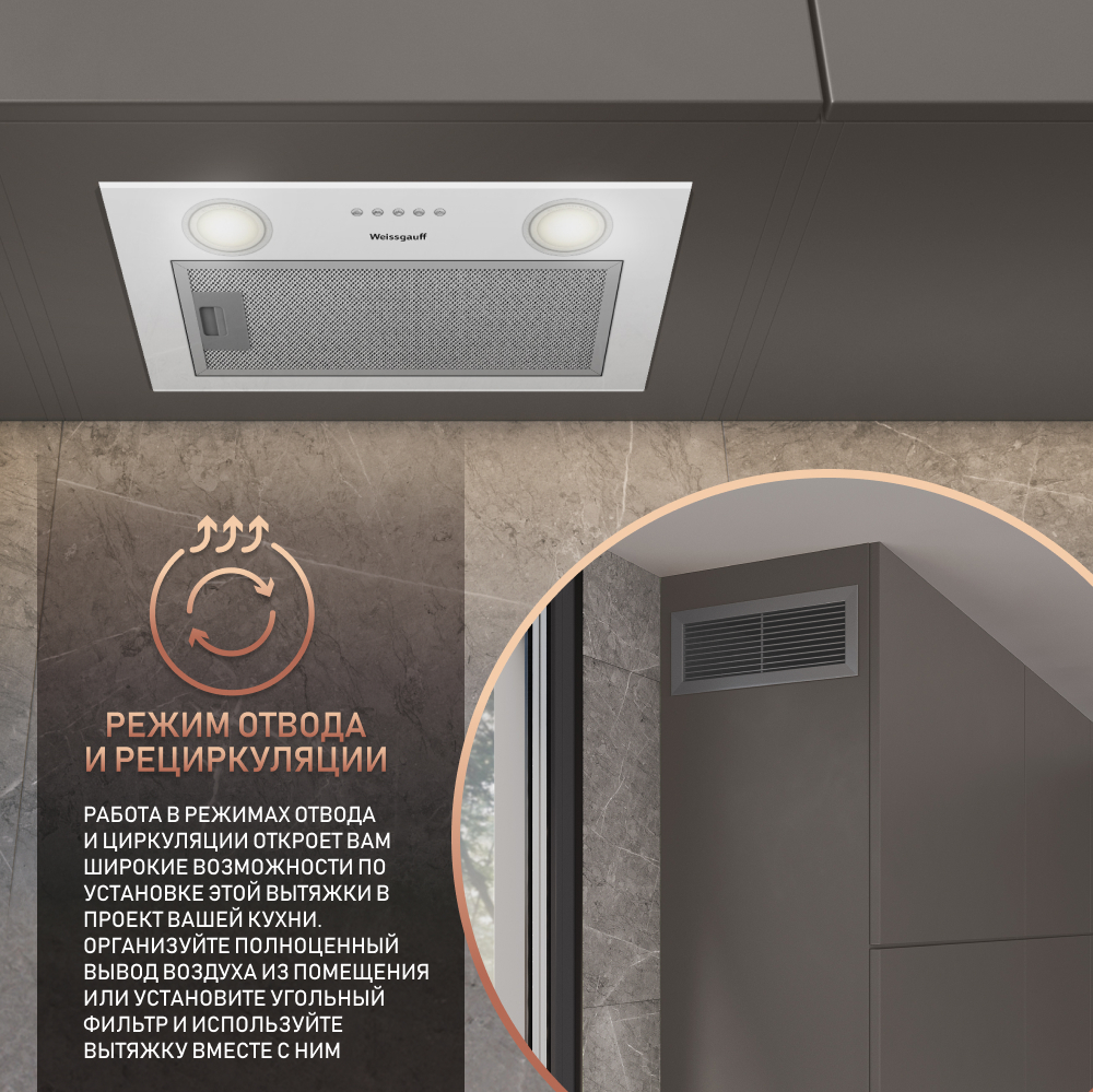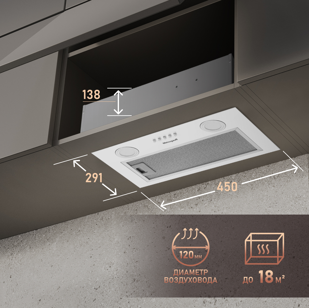 Полностью встраиваемая вытяжка от Weissgauff, воплощающая в себе безупречный дизайн и высокую эффективность, оснащена интуитивно понятным кнопочным управлением и выполнена в дизайне врезного блока с панелью стильного белого цвета!