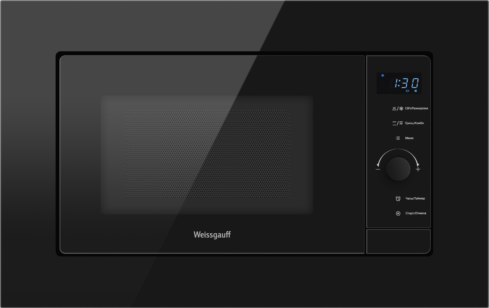 Встраиваемая микроволновая печь Weissgauff с объемом 20 литров, выполненная в черном закаленном стекле, равномерно разогревает еду при помощи поворотного стола, а также оснащена грилем с возможностью работы в комбинированном режиме и набором программ автоменю!