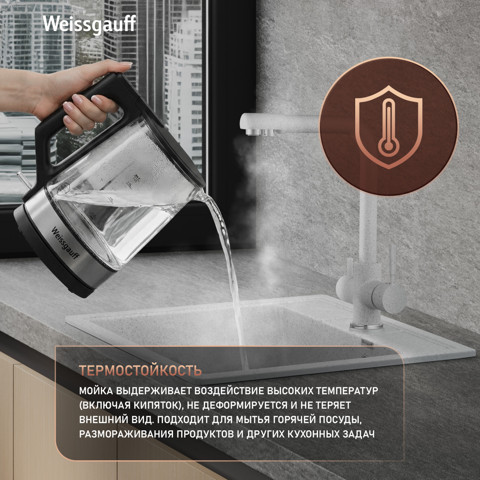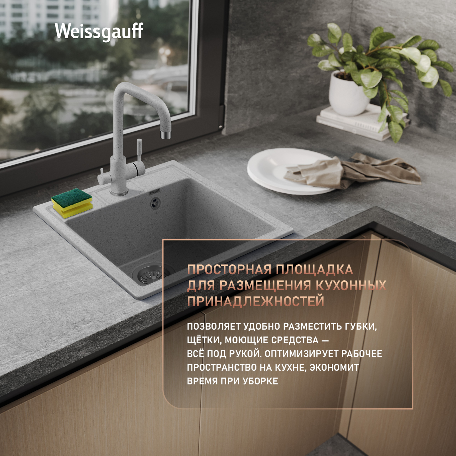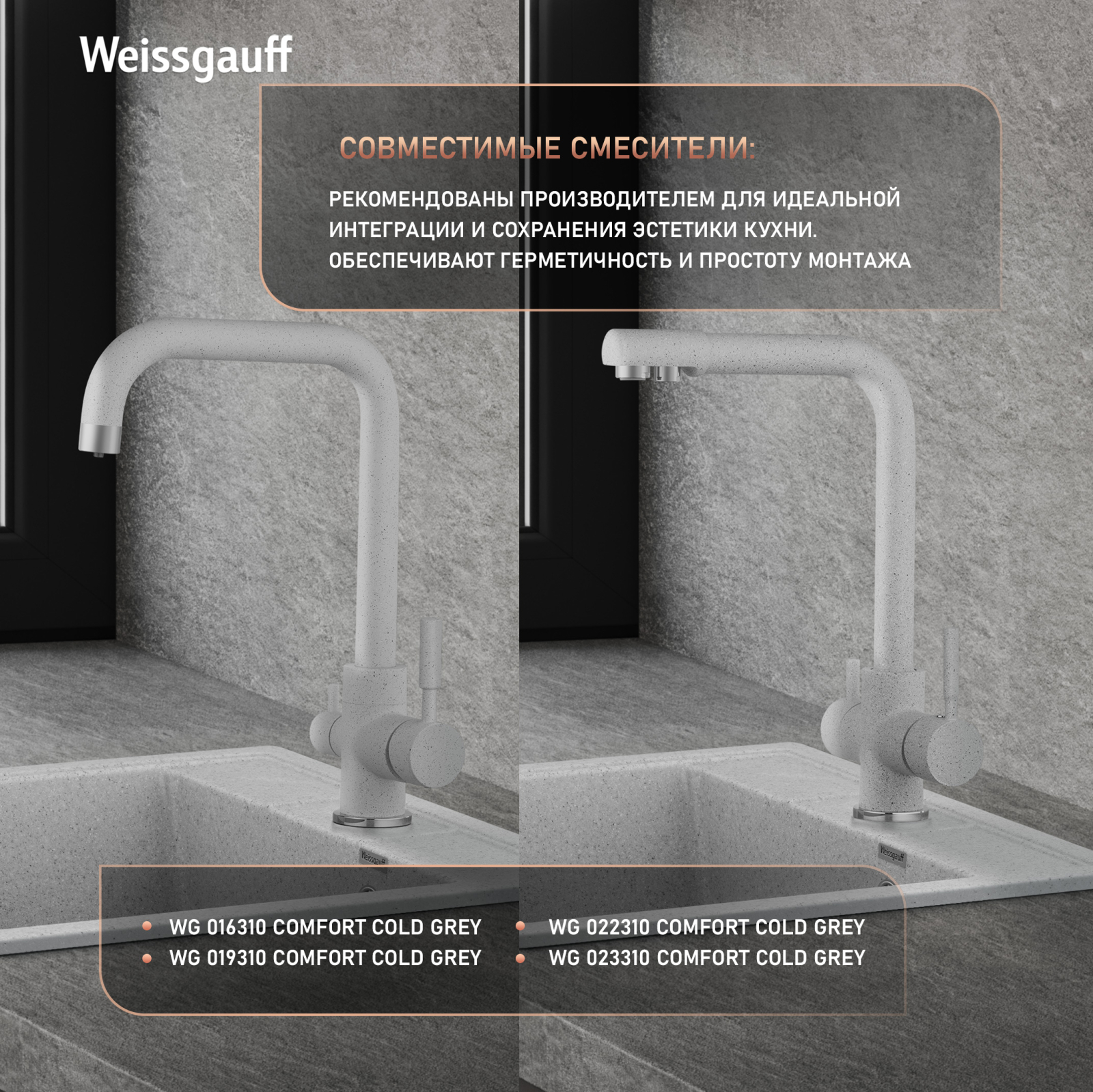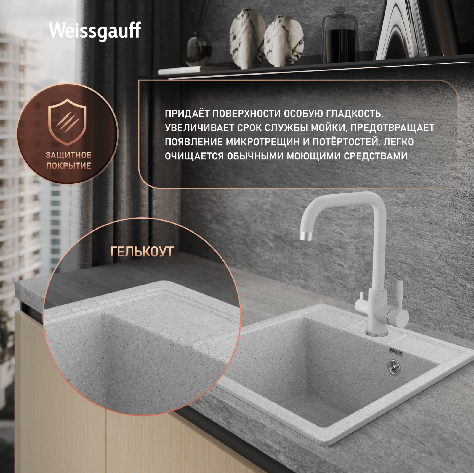 Мойки Weissgauff Comfort WG изготавливаются на современном автоматизированном оборудовании по инжекционной технологии (литье под давлением) и имеют сравнительно малый вес при высокой прочности, что обеспечивает высокий уровень качества и комфортности. Благодаря сочетанию полиэфирных смол и натуральных мраморных наполнителей полученный композитный материал в 8 раз прочнее натурального мрамора, абсолютно экологичен и безопасен для здоровья человека. Декоративно-защитное покрытие - гелькоут не имеет микропор и не впитывает никакие бытовые загрязнения, устойчиво к ультрафиолету, имеет антибактериальные свойства и надежно защищает от механических повреждений. Мойки устойчивы к термическим воздействиям и кипятку, имеют отличное шумопоглощение при падении струи воды и увеличенное сопротивление внешнему износу (царапинам, ударам). Мойки просты в уходе и без труда чистятся неабразивными средствами, очень долго сохраняя свой цвет и первозданный внешний вид.