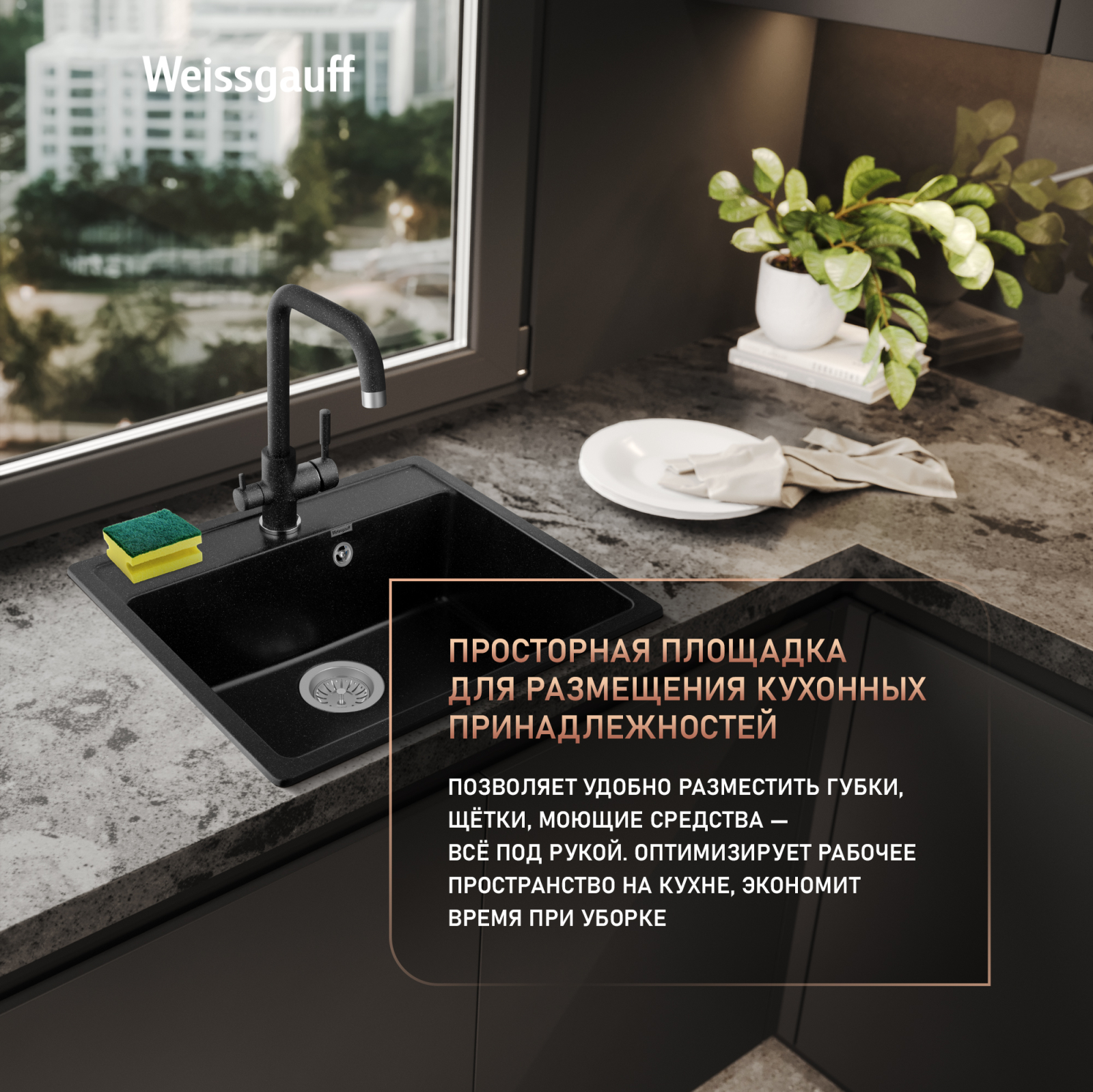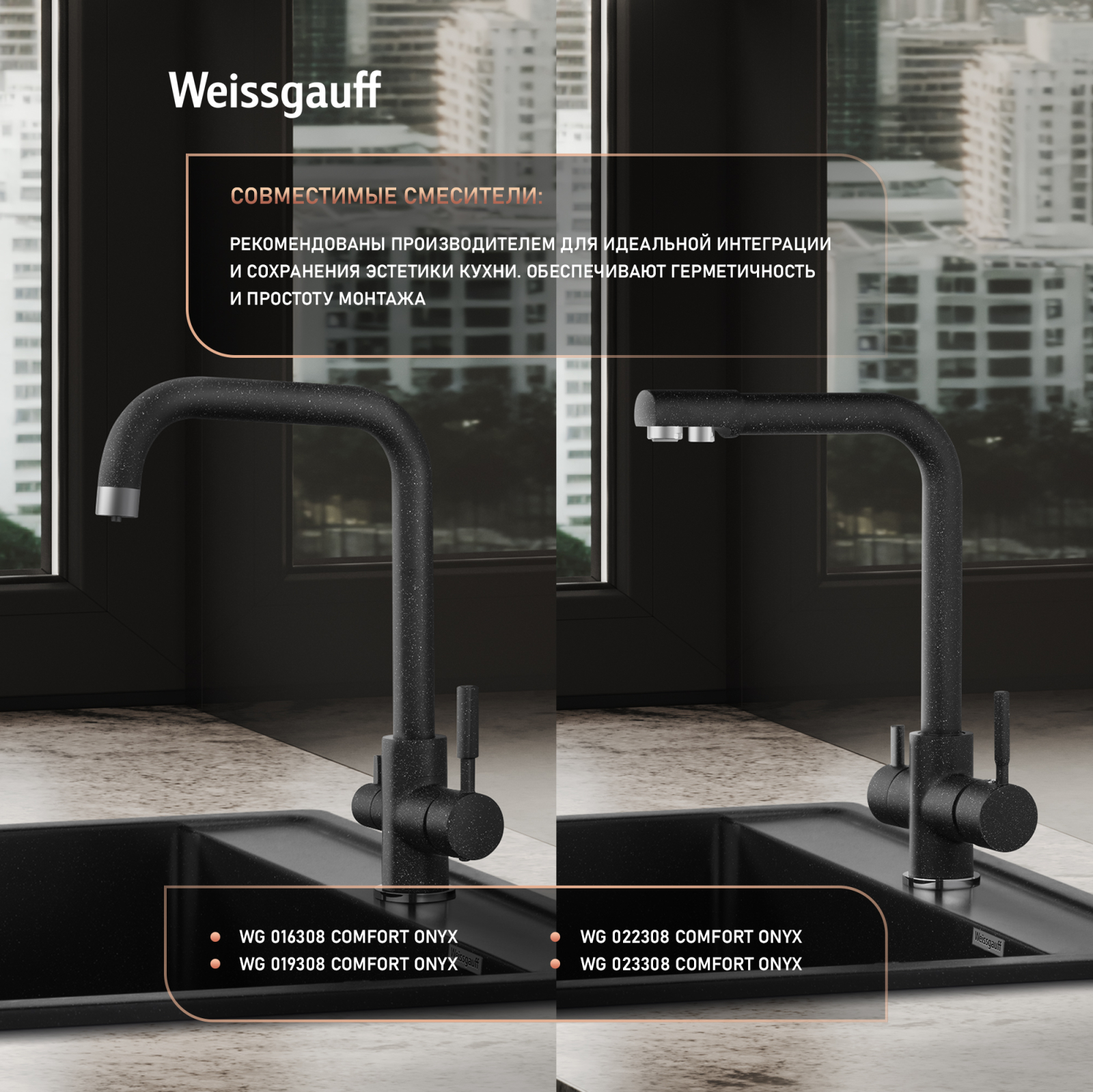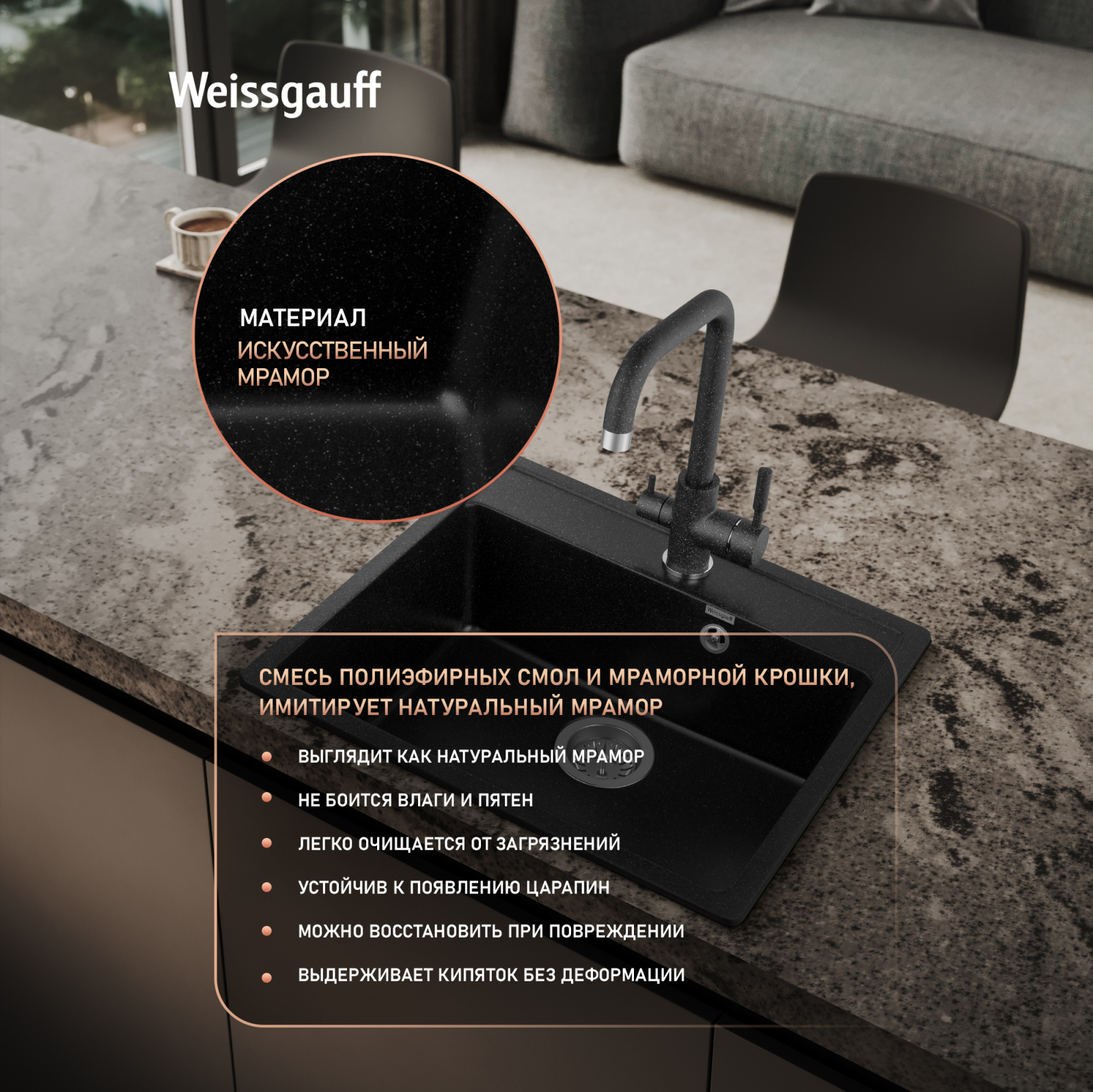 Мойки Weissgauff Comfort изготавливаются на современном автоматизированном оборудовании по инжекционной технологии (литье под давлением) и имеют сравнительно малый вес при высокой прочности, что обеспечивает высокий уровень качества и комфортности. Благодаря сочетанию полиэфирных смол и натуральных мраморных наполнителей полученный композитный материал в 8 раз прочнее натурального мрамора, абсолютно экологичен и безопасен для здоровья человека. Декоративно-защитное покрытие - гелькоут не имеет микропор и не впитывает никакие бытовые загрязнения, устойчиво к ультрафиолету, имеет антибактериальные свойства и надежно защищает от механических повреждений. Мойки Weissgauff Comfort устойчивы к термическим воздействиям и кипятку, имеют отличное шумопоглощение при падении струи воды и увеличенное сопротивление внешнему износу (царапинам, ударам). Мойки просты в уходе и без труда чистятся неабразивными средствами, очень долго сохраняя свой цвет и первозданный внешний вид.