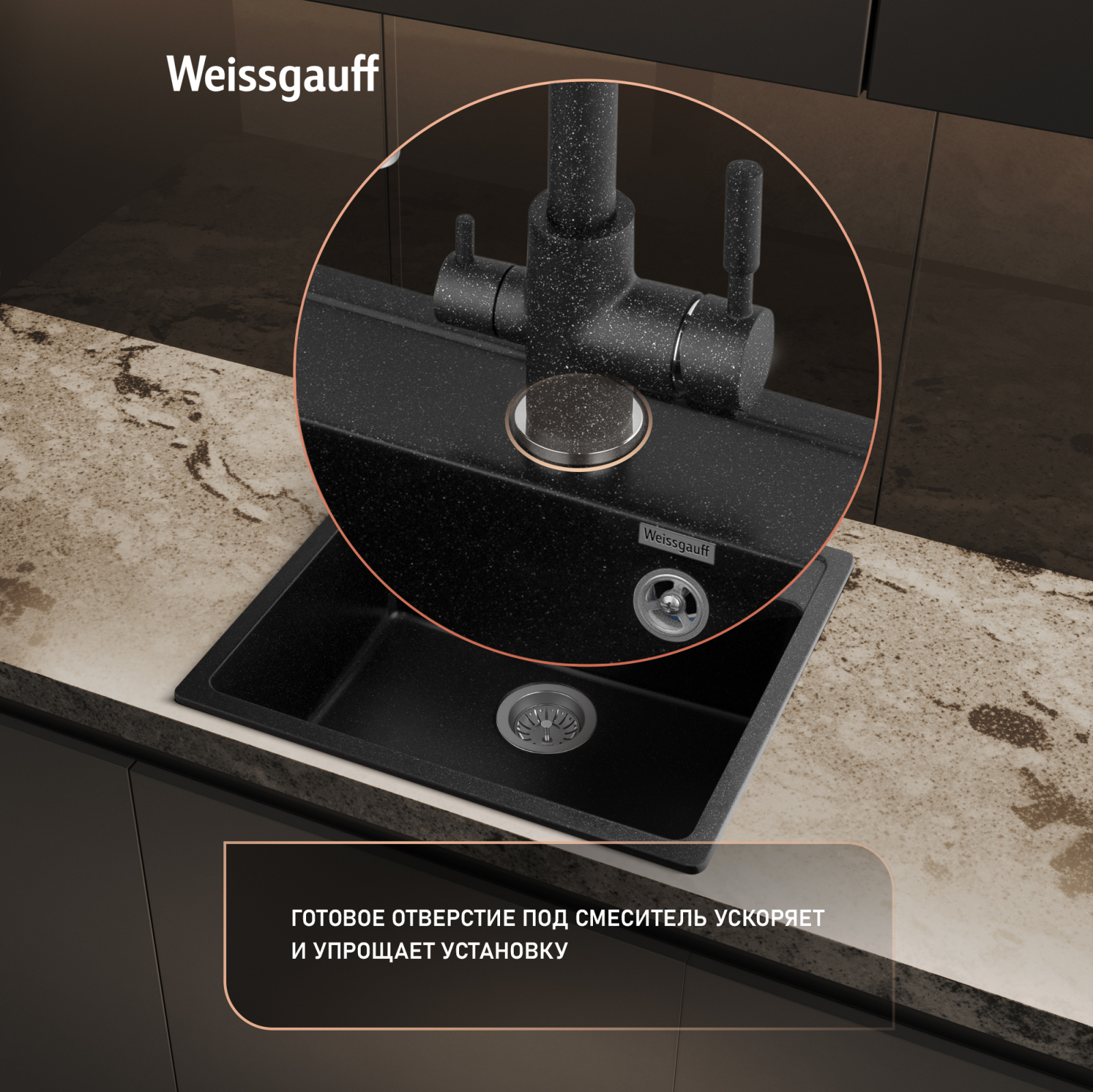 Готовое отверстие под смеситель, предусмотренное нами для вашего удобства, сделает установку этой мойки гораздо более быстрой и простой!
