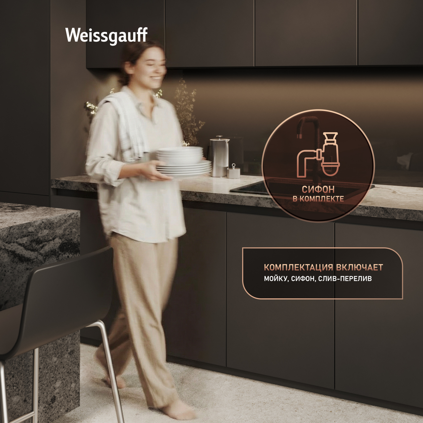 Сифон, прилагающийся в комплекте с мойкой, избавит вас от необходимости искать и приобретать его дополнительно. Теперь вы можете выполнить монтаж мойки и сифона практически сразу "под ключ", ведь мы в Weissgauff знаем, как важно и ценно время наших клиентов!