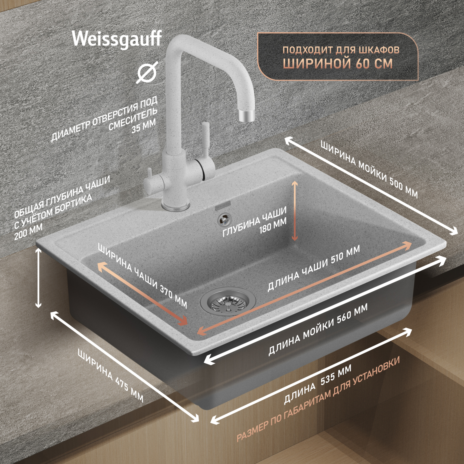 Установка в шкаф шириной от 60 см - дает возможность осуществить монтаж мойки практически в любую столешницу и открывает широкий спектр возможностей при проектировании кухни вашей мечты!