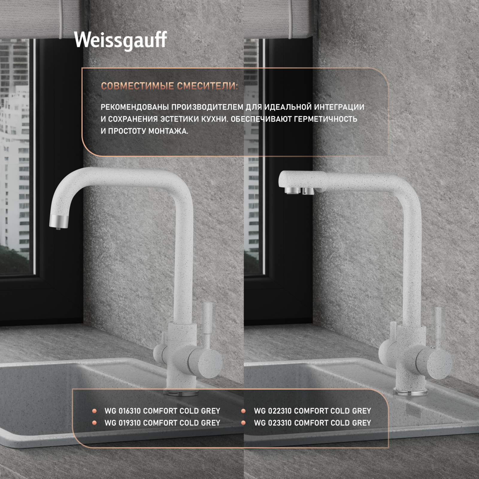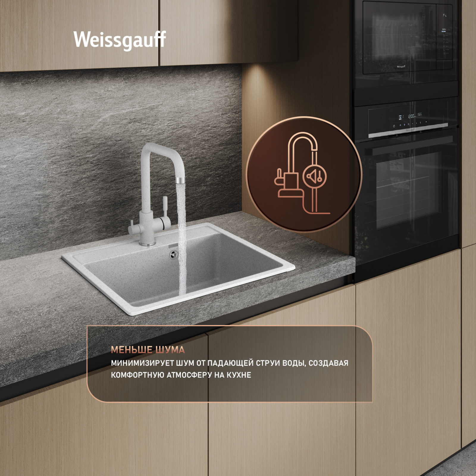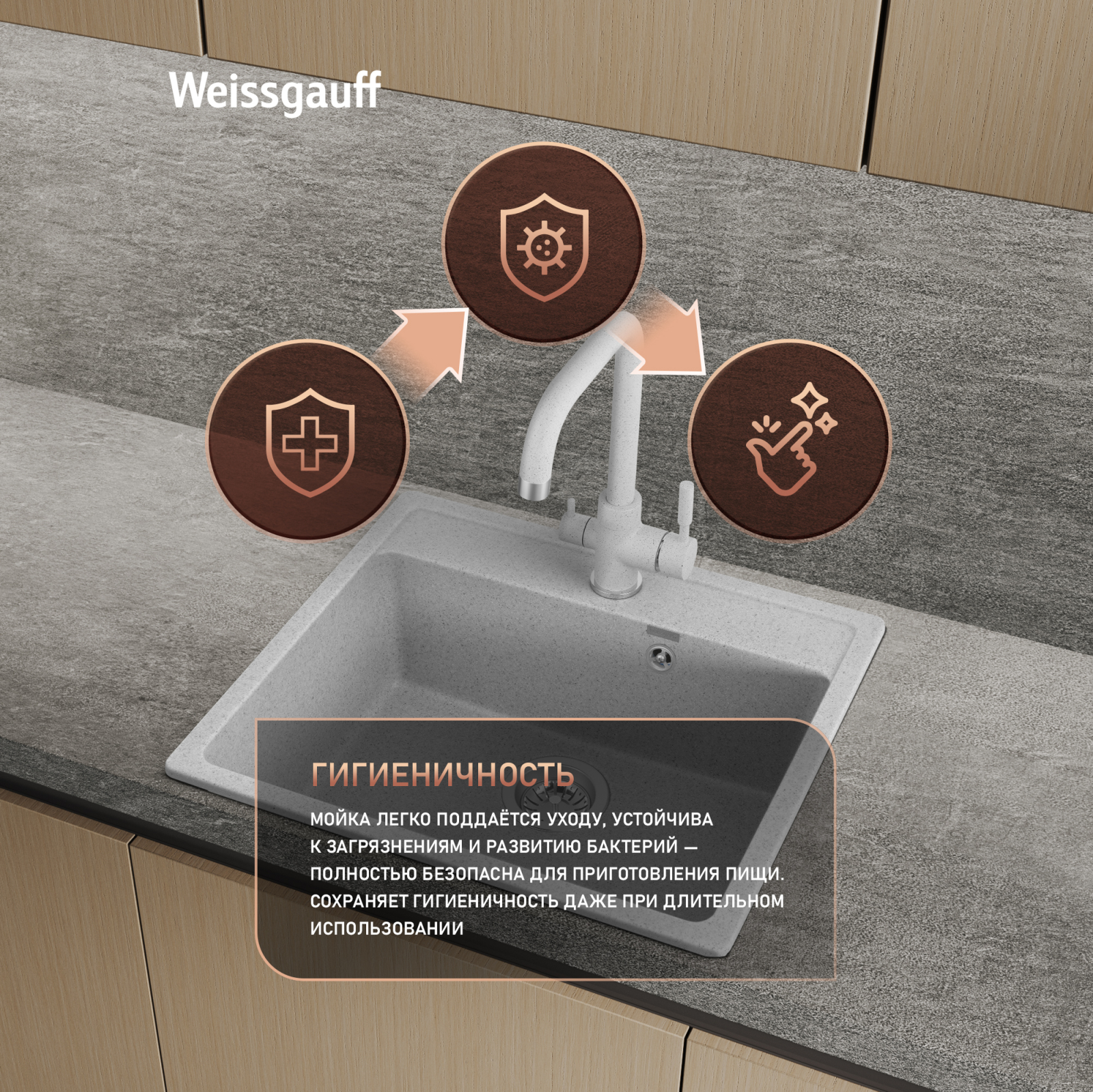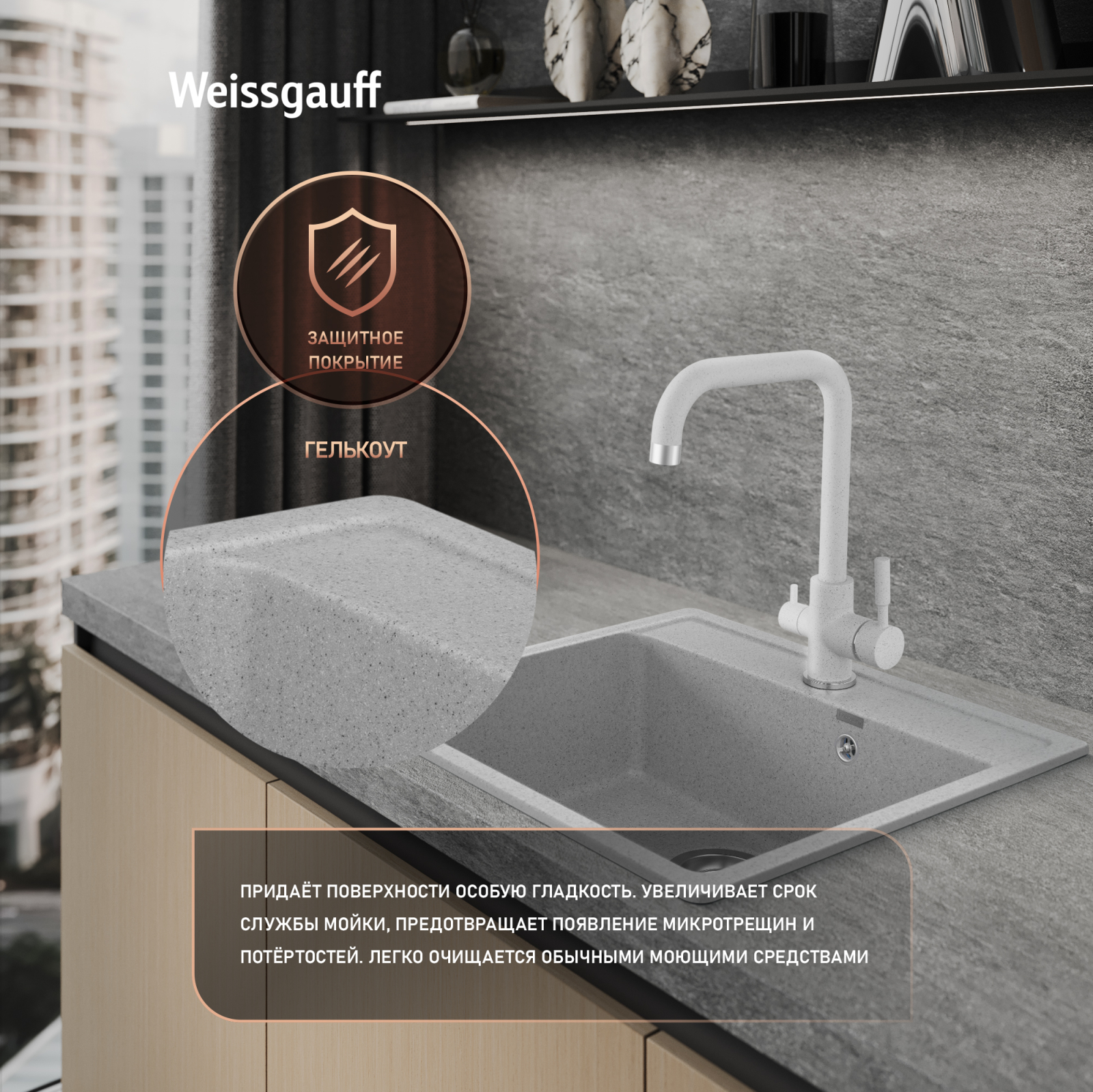 Мойки Weissgauff Comfort изготавливаются на современном автоматизированном оборудовании по инжекционной технологии (литье под давлением) и имеют сравнительно малый вес при высокой прочности, что обеспечивает высокий уровень качества и комфортности. Благодаря сочетанию полиэфирных смол и натуральных мраморных наполнителей полученный композитный материал в 8 раз прочнее натурального мрамора, абсолютно экологичен и безопасен для здоровья человека. Декоративно-защитное покрытие - гелькоут не имеет микропор и не впитывает никакие бытовые загрязнения, устойчиво к ультрафиолету, имеет антибактериальные свойства и надежно защищает от механических повреждений. Мойки Weissgauff Comfort устойчивы к термическим воздействиям и кипятку, имеют отличное шумопоглощение при падении струи воды и увеличенное сопротивление внешнему износу (царапинам, ударам). Мойки просты в уходе и без труда чистятся неабразивными средствами, очень долго сохраняя свой цвет и первозданный внешний вид.