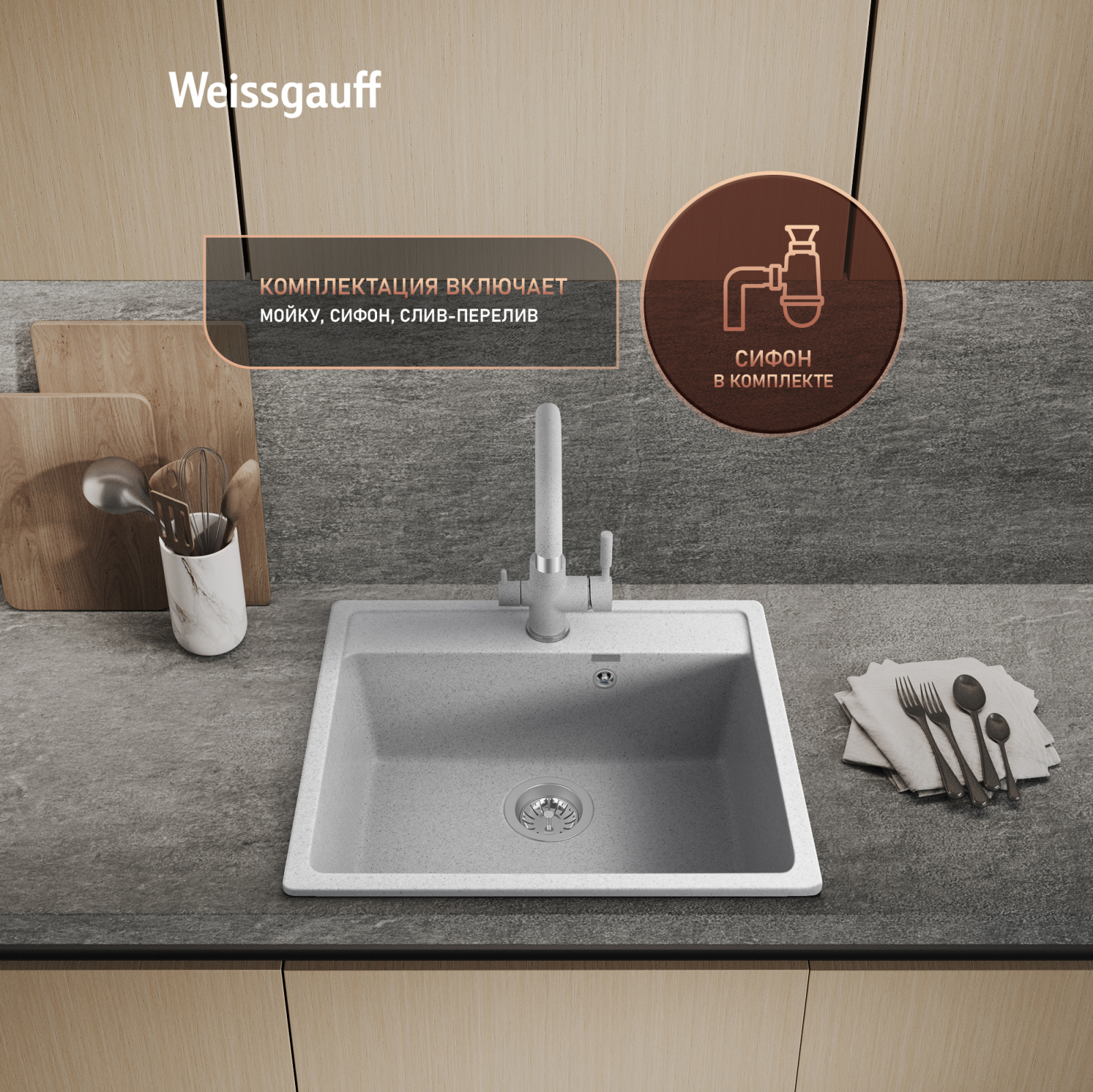 Сифон, прилагающийся в комплекте с мойкой, избавит вас от необходимости искать и приобретать его дополнительно. Теперь вы можете выполнить монтаж мойки и сифона практически сразу "под ключ", ведь мы в Weissgauff знаем, как важно и ценно время наших клиентов!