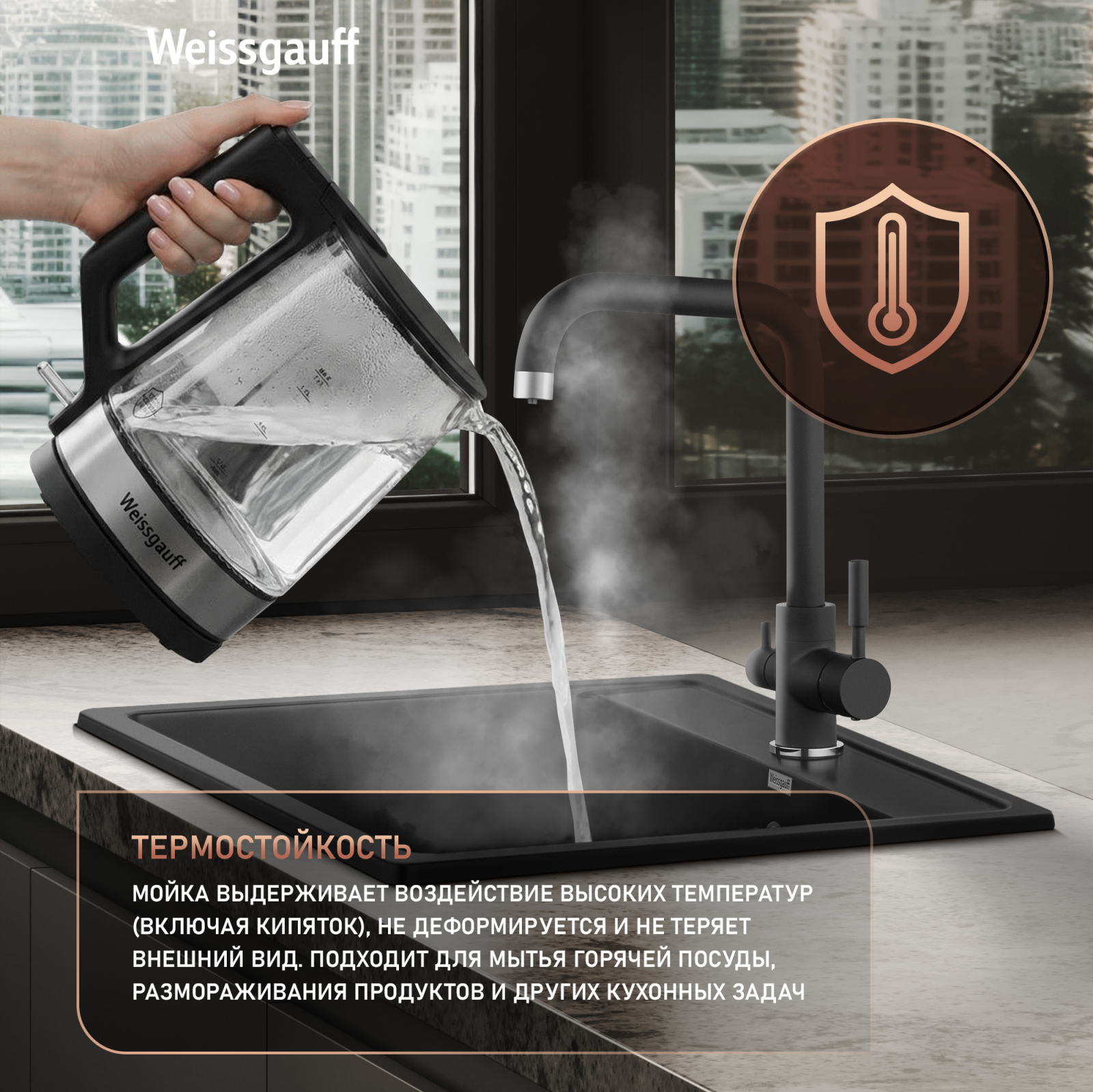 Мойки Weissgauff Comfort изготавливаются на современном автоматизированном оборудовании по инжекционной технологии (литье под давлением) и имеют сравнительно малый вес при высокой прочности, что обеспечивает высокий уровень качества и комфортности. Благодаря сочетанию полиэфирных смол и натуральных мраморных наполнителей полученный композитный материал в 8 раз прочнее натурального мрамора, абсолютно экологичен и безопасен для здоровья человека. Декоративно-защитное покрытие - гелькоут не имеет микропор и не впитывает никакие бытовые загрязнения, устойчиво к ультрафиолету, имеет антибактериальные свойства и надежно защищает от механических повреждений. Мойки Weissgauff Comfort устойчивы к термическим воздействиям и кипятку, имеют отличное шумопоглощение при падении струи воды и увеличенное сопротивление внешнему износу (царапинам, ударам). Мойки просты в уходе и без труда чистятся неабразивными средствами, очень долго сохраняя свой цвет и первозданный внешний вид.