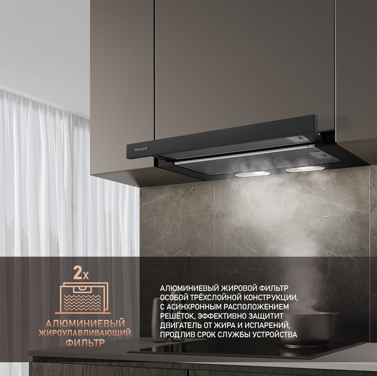 Алюминиевый жировой фильтр особой конструкции, с асинхронным расположением решёток, эффективно защитит двигатель от жира и испарений, продлив срок службы устройства.