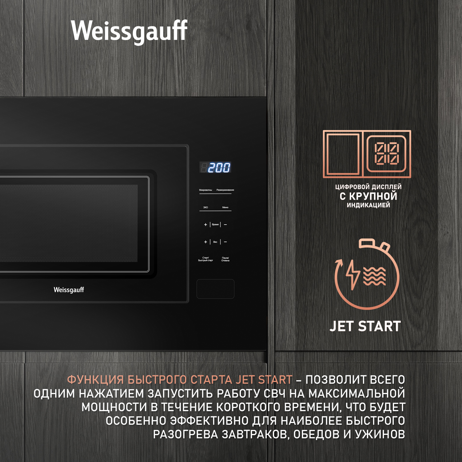 Встраиваемая микроволновая печь Weissgauff с объемом 20 литров, выполненная в дизайне Compact, сохраняющем свободное место на вашей кухне, с панелью управления в черном цвете, равномерно разогревает еду при помощи поворотного стола!