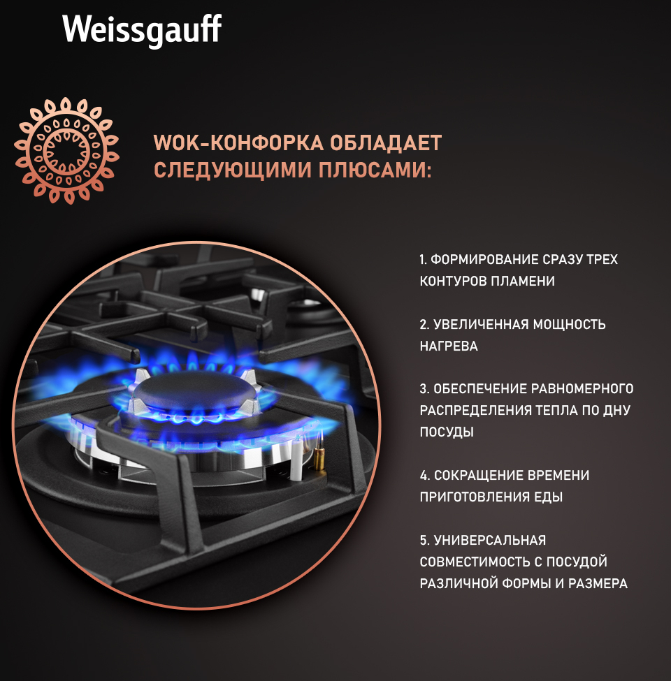 WOK-конфорка имеет два ряда пламени, что позволяет использовать посуду большого объёма и приготовить еду, экономя тем самым время, газ и сохраняя при этом максимум полезных веществ в продуктах!