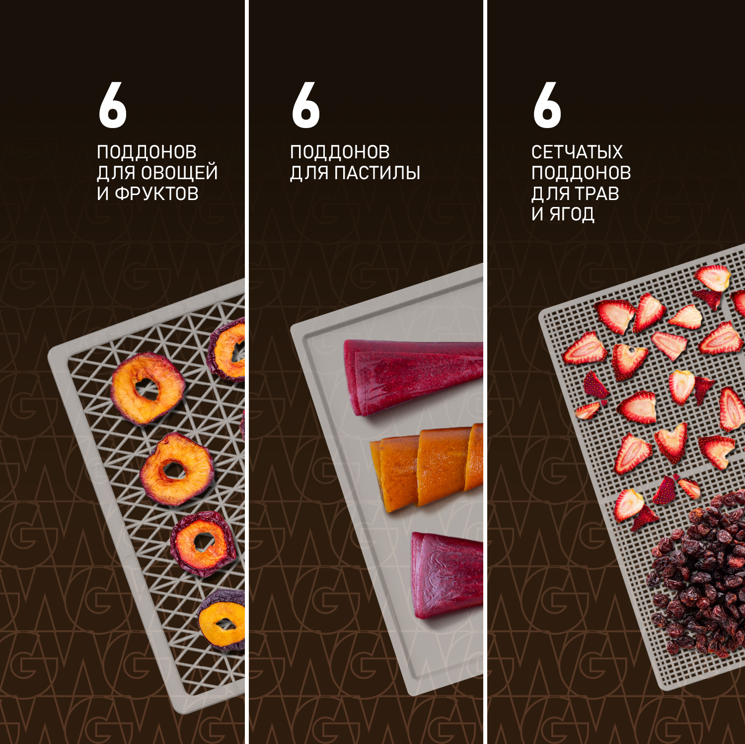 • Богатая комплектация устройства включает в себя - 6 поддонов для овощей и фруктов, 6 поддонов для пастилы и 6 поддонов для трав — всё, что нужно для приготовления вашего любимого продукта!