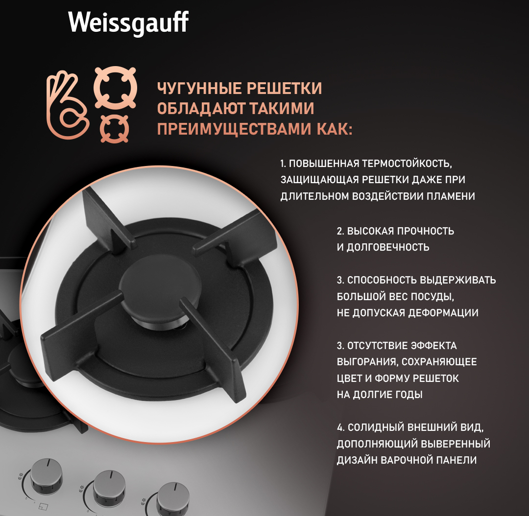 Решетки из высококачественного чугуна это неизменное качество, надежность и долговечность, воплощенные в каждой детали! А особая элегантность их дизайна не только послужит отличным дополнением к общему стилю варочной панели, но и существенно облегчит очистку и уход за ней. А благодаря особому вниманию Weissgauff к каждой детали, вы еще не раз оцените устойчивость и эргономичность этих решеток!