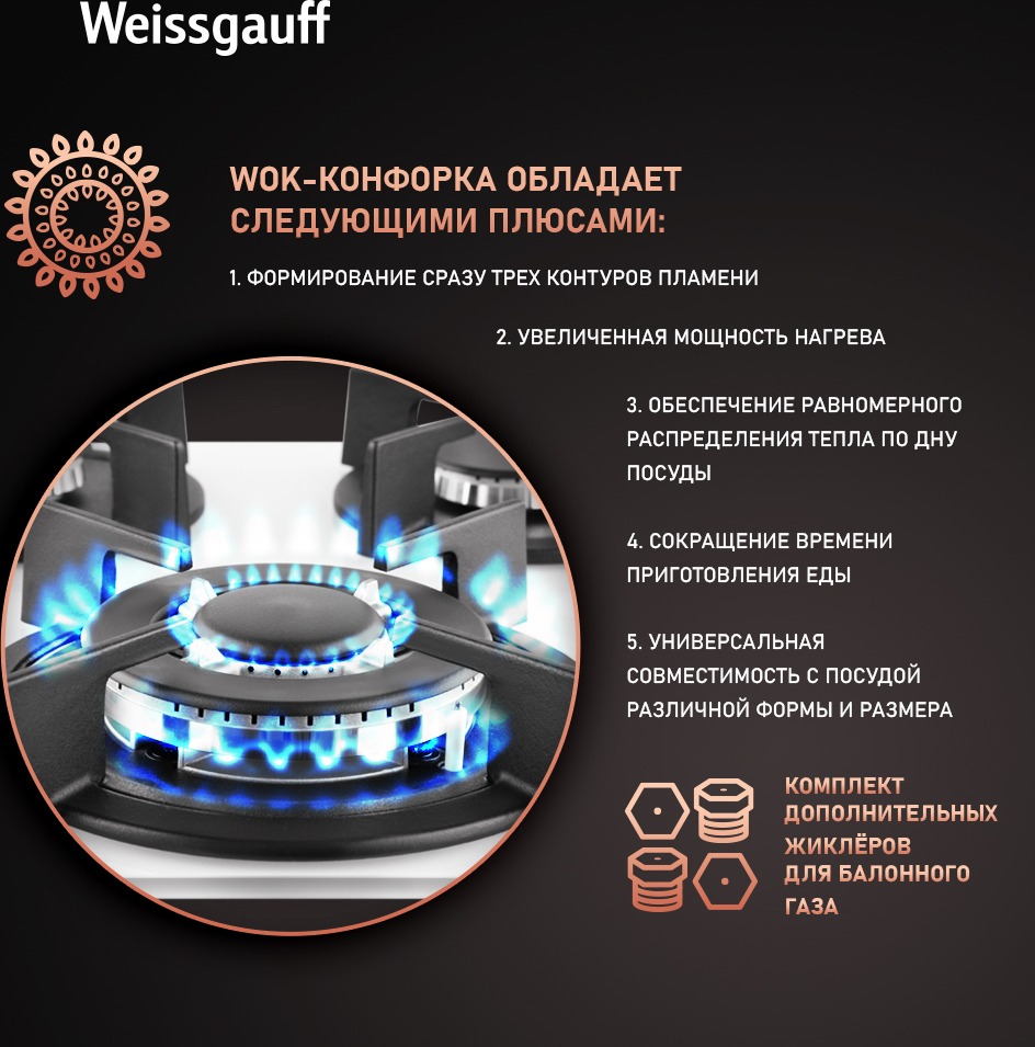 WOK-конфорка мощностью 3,4 кВт, которая создаёт сразу три кольца пламени и позволяет осуществить нагрев даже самой крупногабаритной посуды в кратчайший срок!