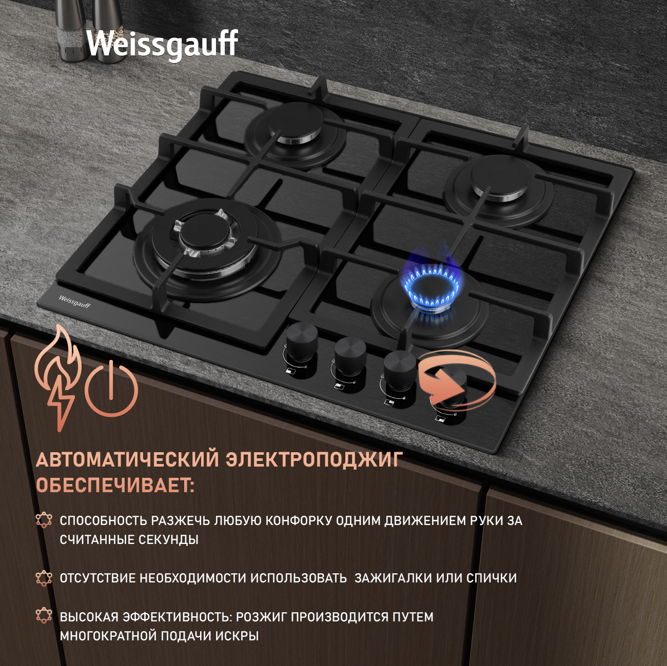 Автоматический электроподжиг, независимо встроенный в каждую из рукояток, позволит зажечь любую конфорку, всего одним нажатием и поворотом руки, не прибегая к дополнительным приспособлениям!