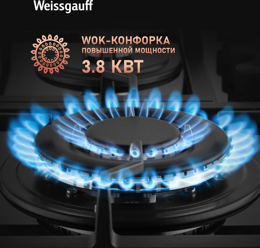 WOK-конфорка мощностью 3,8 кВт имеет два ряда пламени, что позволяет использовать посуду большого объёма и приготовить еду, экономя тем самым время, газ и сохраняя при этом максимум полезных веществ в продуктах!