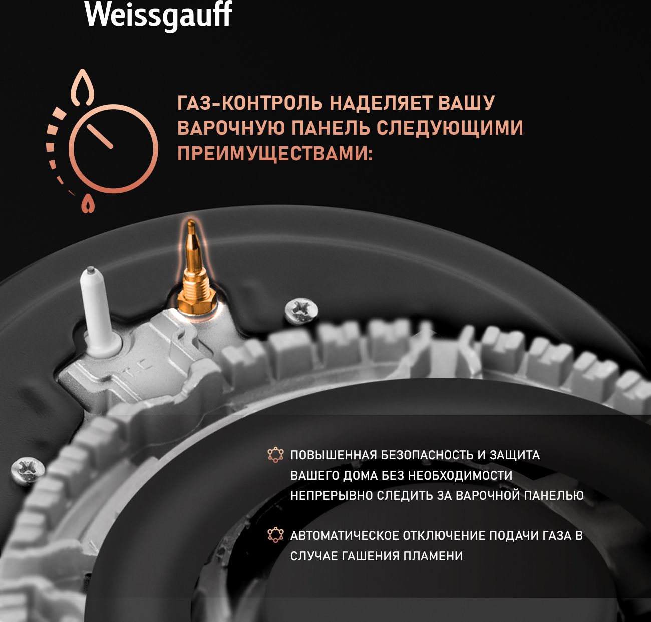 Газ-контроль каждой конфорки обеспечивает безопасность: в случае, если пламя погасло, подача газа будет автоматически прекращена!