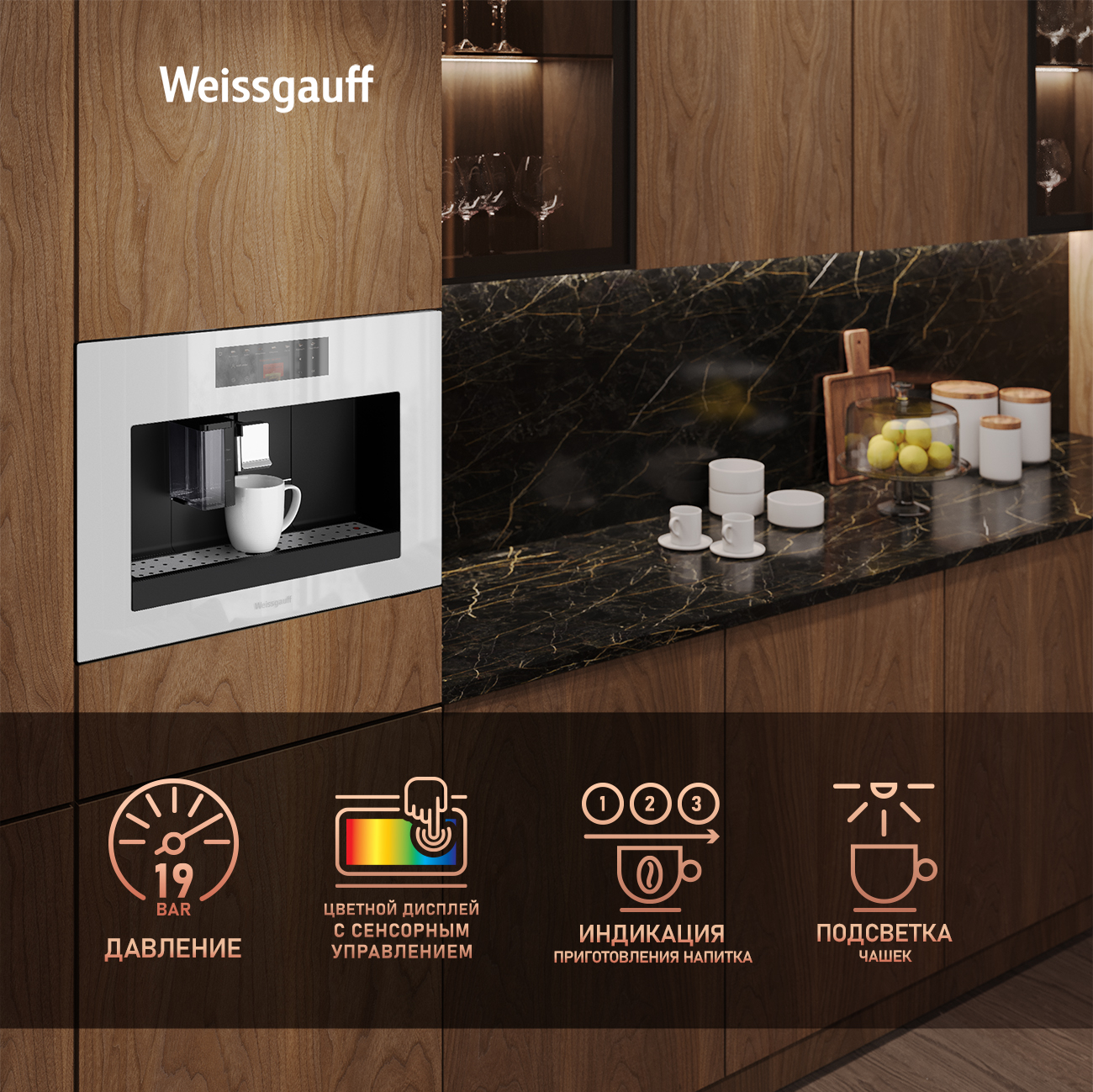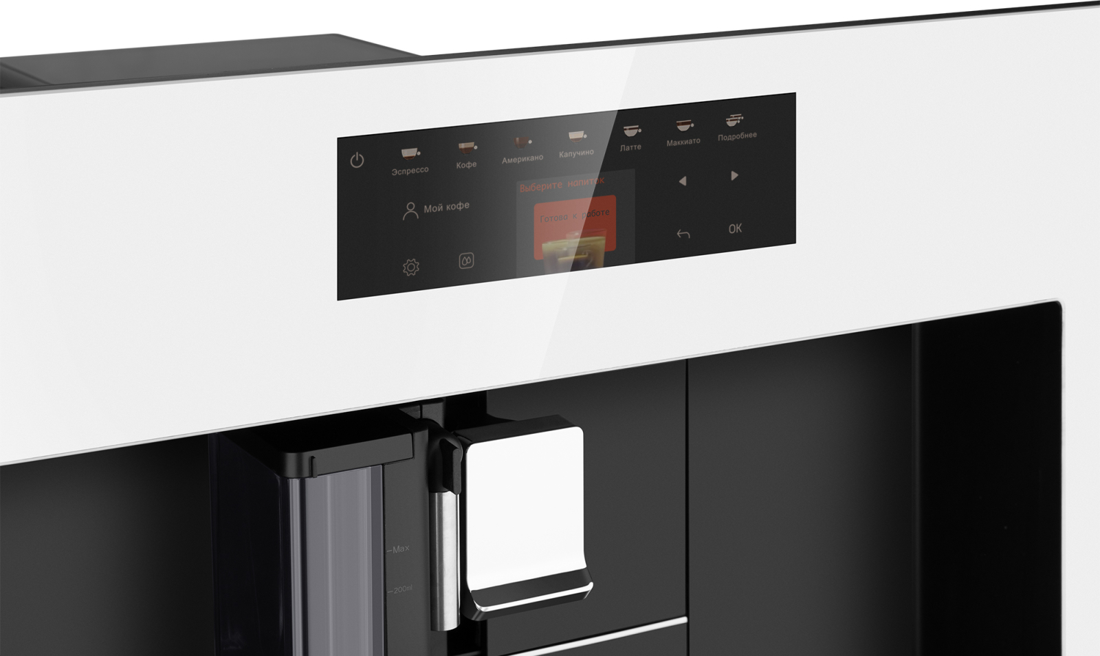 Встраиваемая кофемашина от Weissgauff, выполненная в белом цвете, оснащенная вместительным контейнером для зерен на 200 граммов и емкостью для молотого кофе на 10 порций, обладающая цветным сенсорным дисплеем, системой подачи молока с капучинатором, внешней емкостью для молока, а также 16 заранее предустановленными программами для приготовления ароматного вкуснейшего кофе и напитков прямо на вашей кухне!