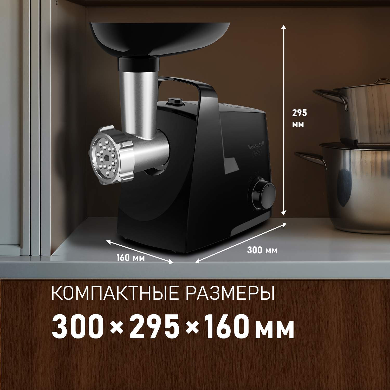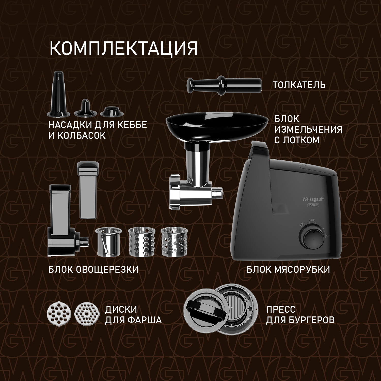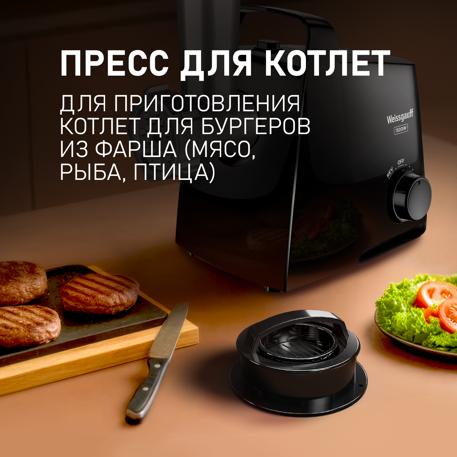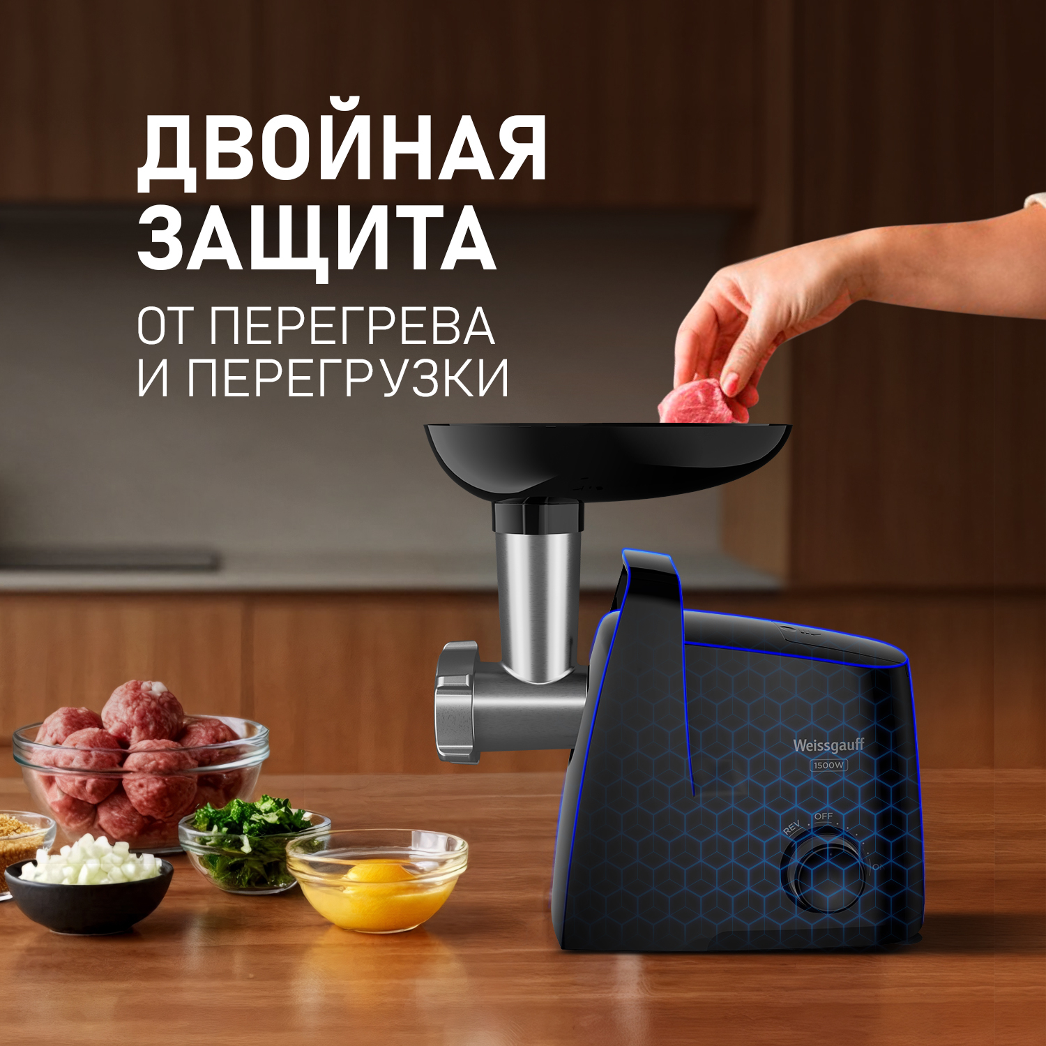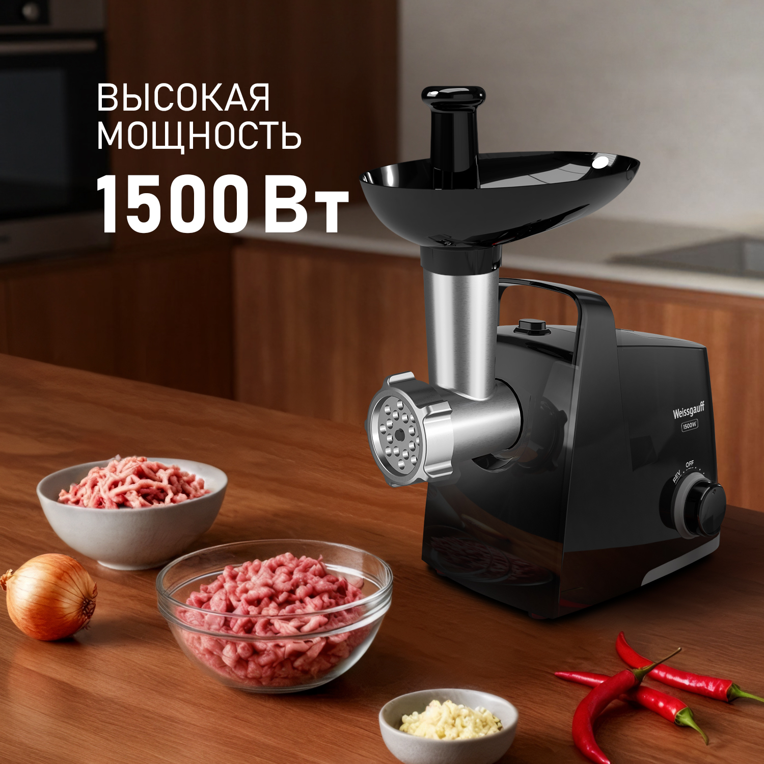 Электрическая мясорубка от Weissgauff, обладающая впечатляющей мощностью до 1500 Вт, имеющая интуитивно понятное и простое управление, укомплектованная двумя видами решеток для фарша различной толщины и дополнительными насадками для колбасок и кеббе - это действительно эффективное устройство, способное сделать работу по приготовлению фарша по-настоящему легкой и быстрой!