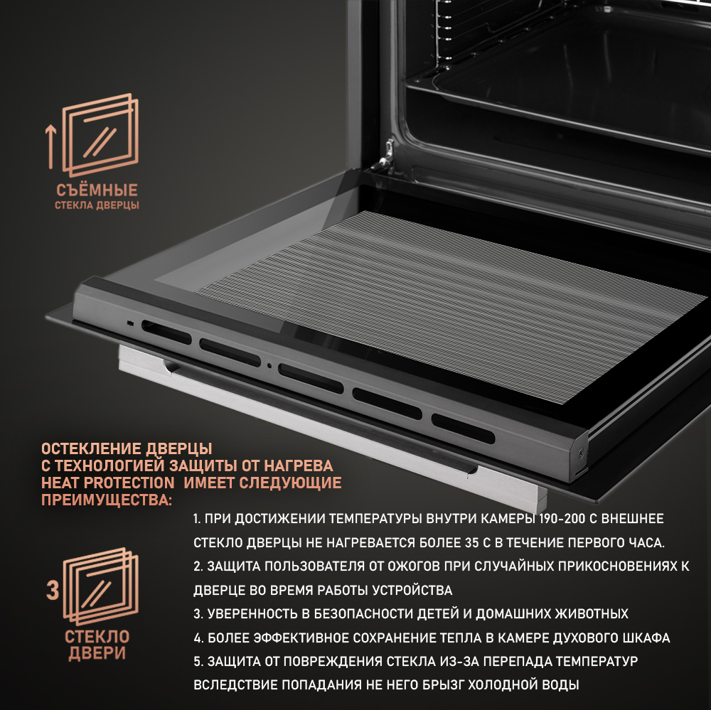 Тройное стекло дверцы с технологией защиты от нагрева Heat Protection, при которой во время достижения температуры внутри камеры 190-200 С внешнее стекло дверцы не нагревается более 35 С в течение первого часа. Эта технология воплощает в себе весь подход к безопасности и термозащите, который Weissgauff реализовали в данной модели. Такое стекло обеспечивает вам значительно большую степень защиты при случайных прикосновениях к нагревающейся дверце плиты, чем в моделях, не оснащенных технологией многослойного стекла. Для нас в Weissgauff важно, чтобы работа с бытовой техникой была не только приятной, но и безопасной!