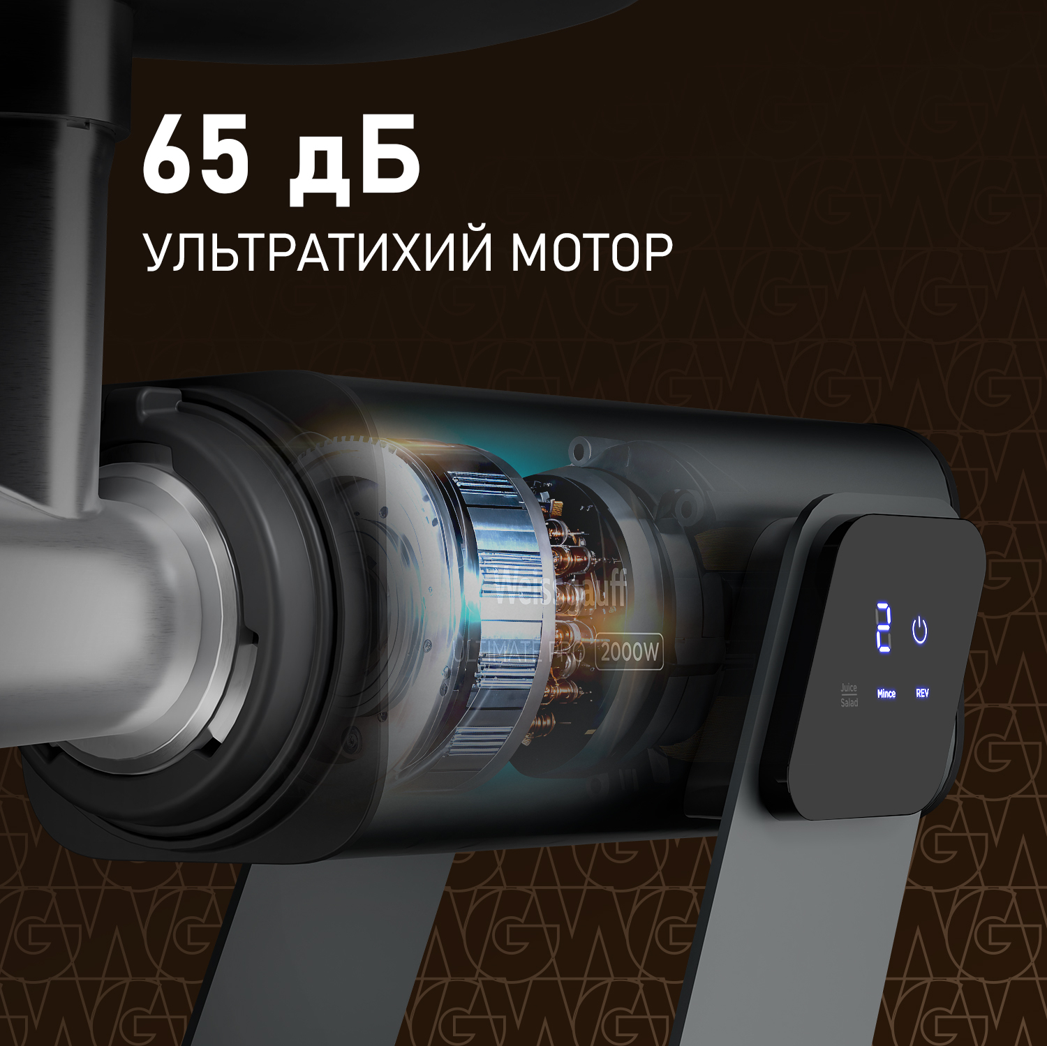 Ультра тихий DC-мотор позволяет делать работу прибора практически бесшумной, и при всей мощности мясорубка способна работать очень тихо и без вибрации, уровень шума не превышает 65 дБ.