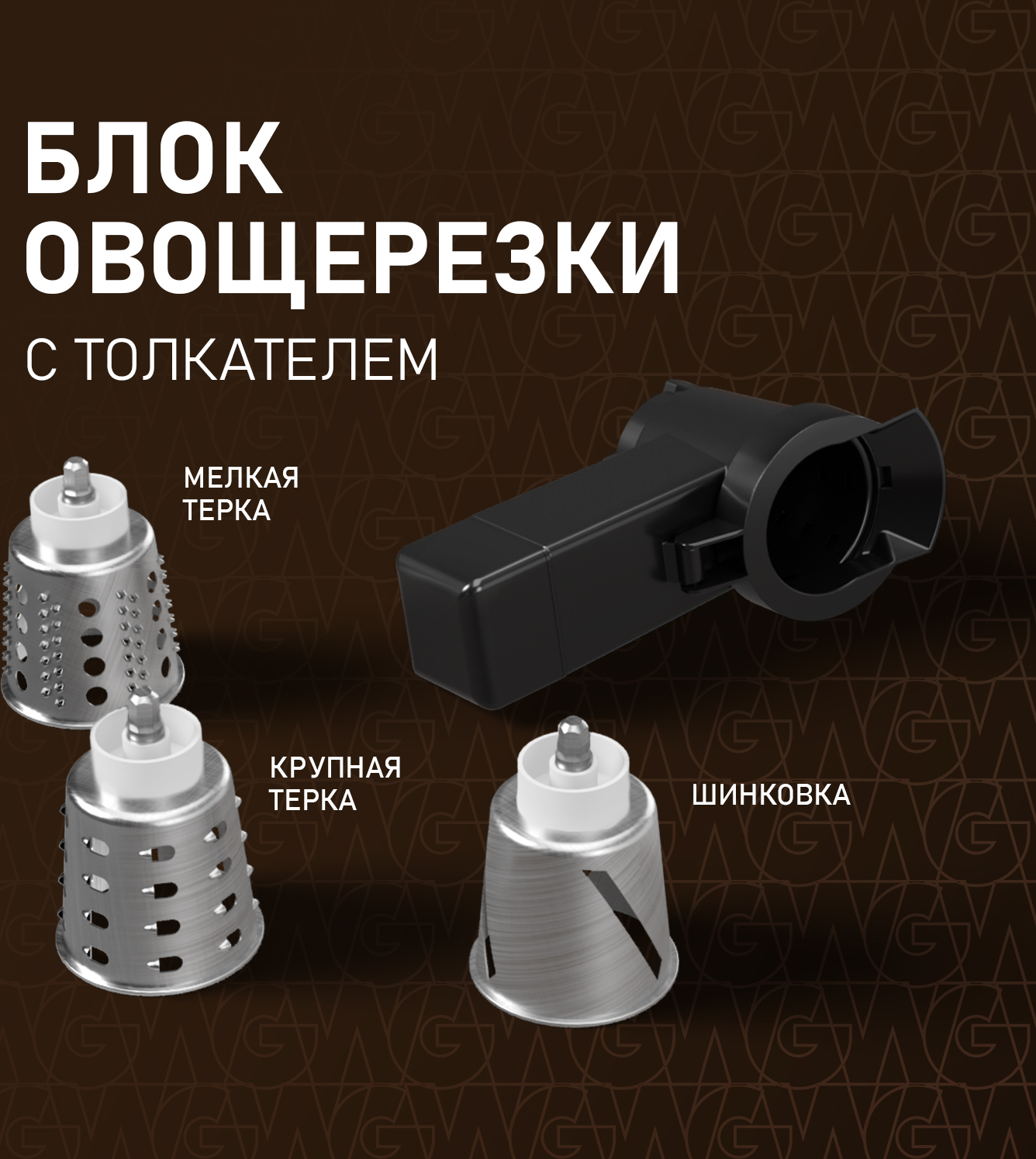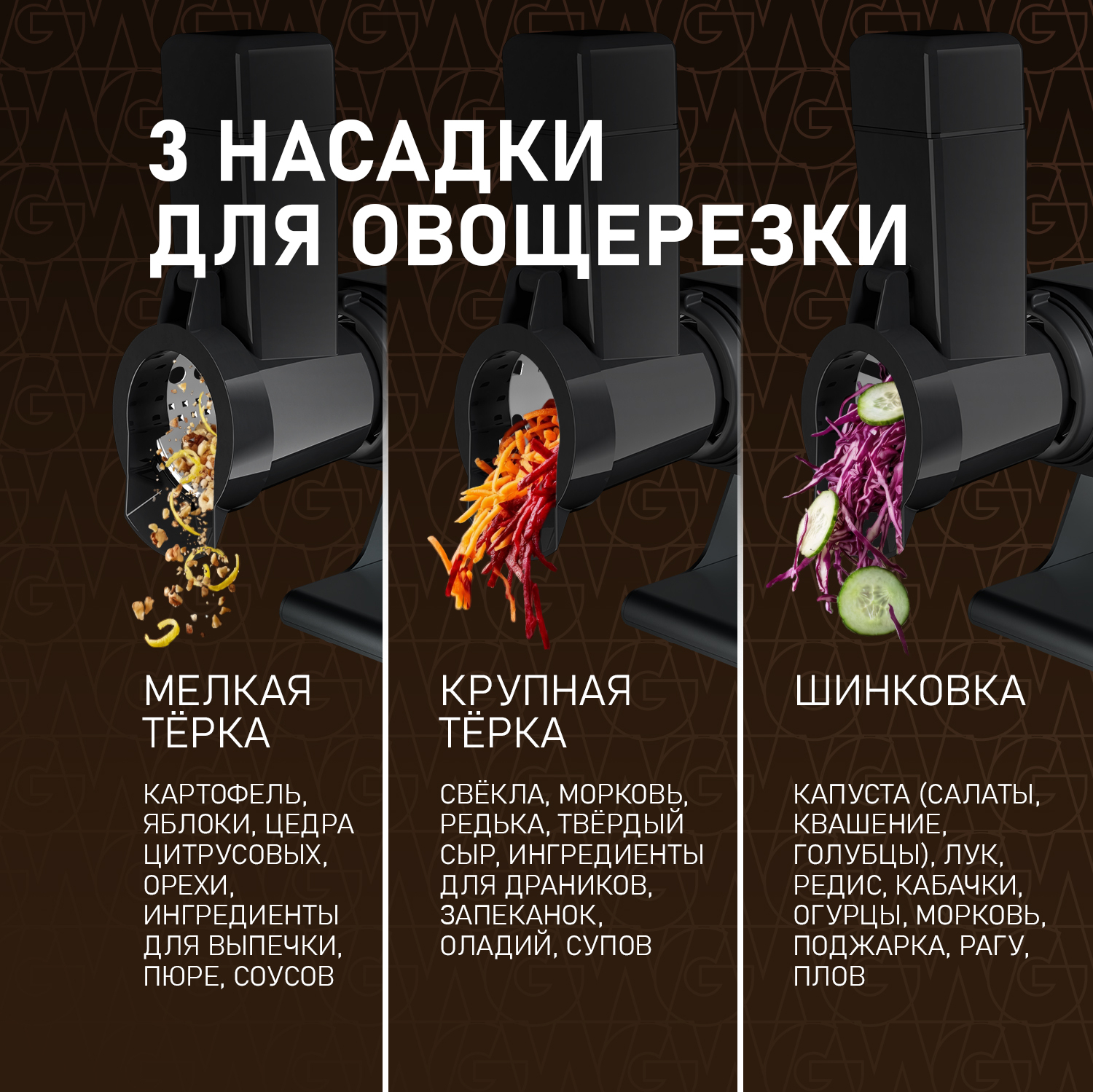Насадка-шинковка и три насадки-терки с крупными и мелкими отверстиями помогут быстро и удобно нарезать овощи для салатов, горячих блюд, консервированных заготовок.