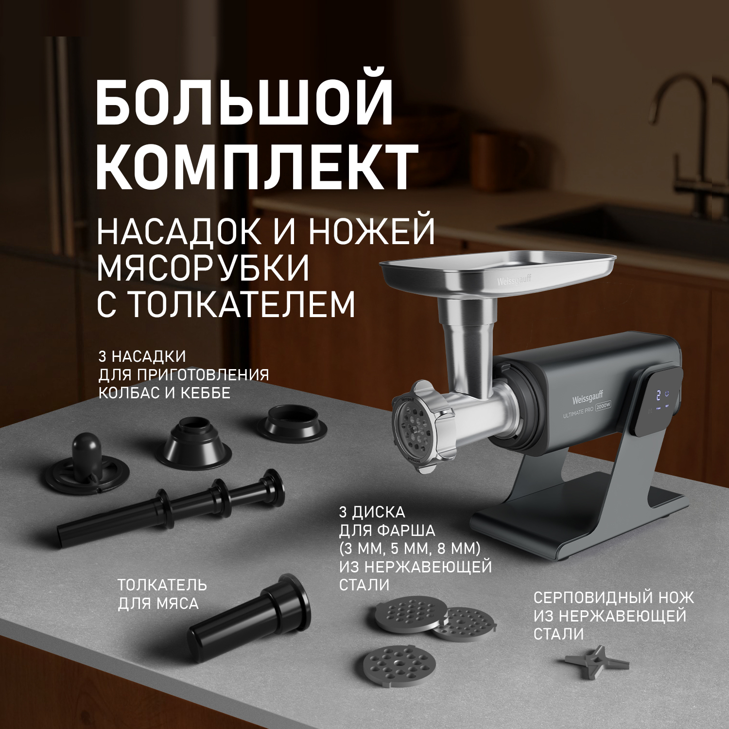 Нож и решетки для мясорубки, выполненные из высококачественной нержавеющей стали, обеспечат непревзойденную долговечность и то самое легендарное качество, которым так славится продукция Weissgauff! Защита от коррозии и повреждений, повышенная прочность и износостойкость даже при интенсивной и продолжительной работе с мясом — вот лишь некоторые из преимуществ, которыми Вас порадует данная модель!