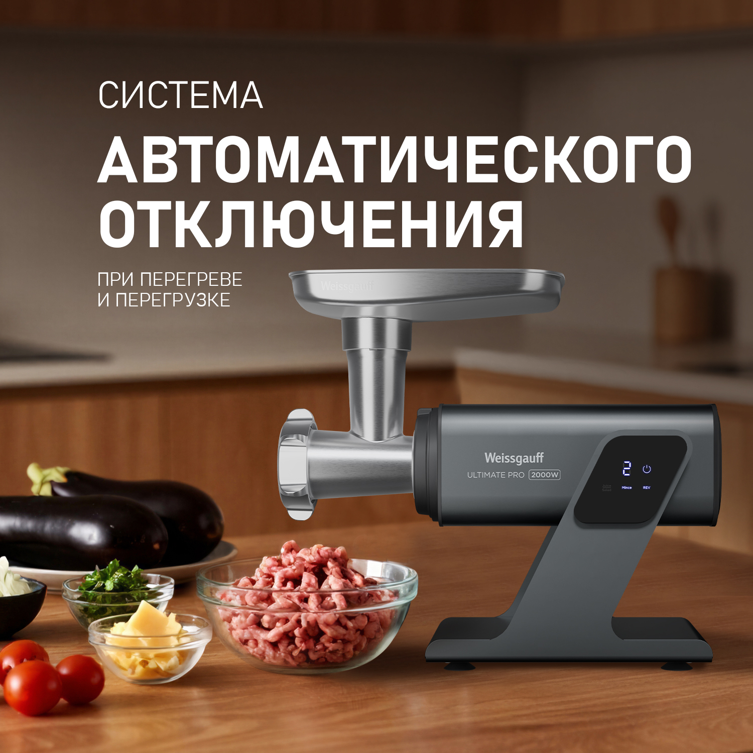 Цифровой дисплей с крупной индикацией и сенсорным управлением отобразит все необходимые показатели работы, делая работу с вашей электрической мясорубкой еще более удобной!