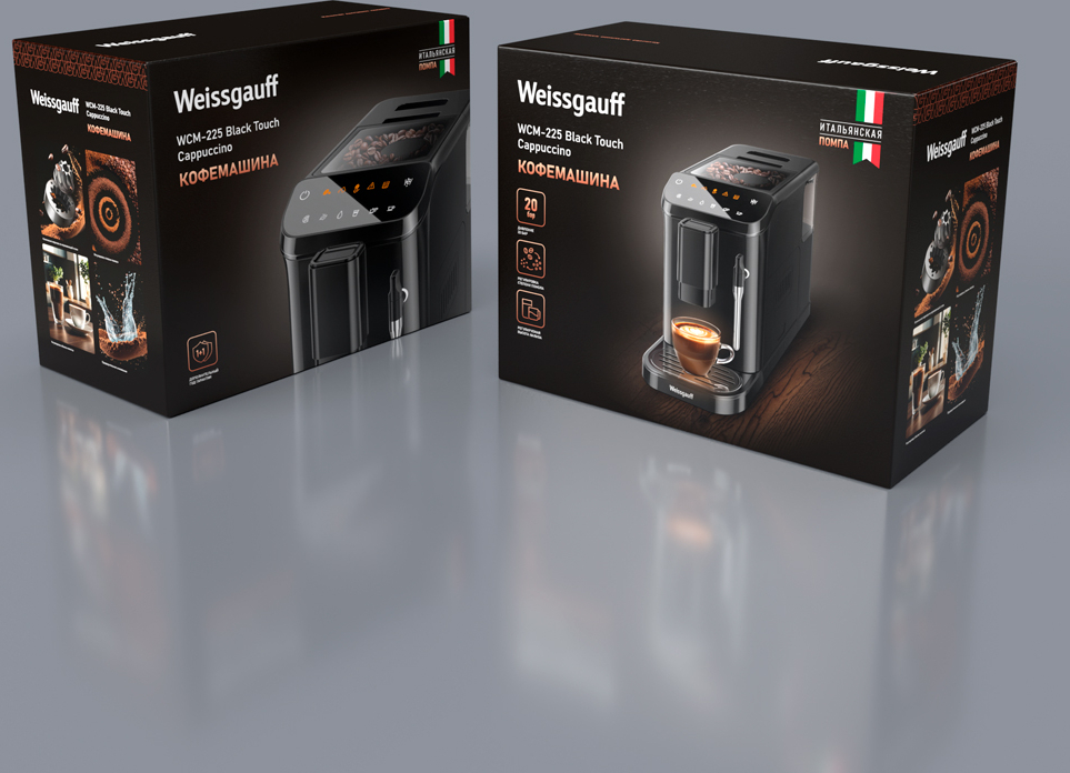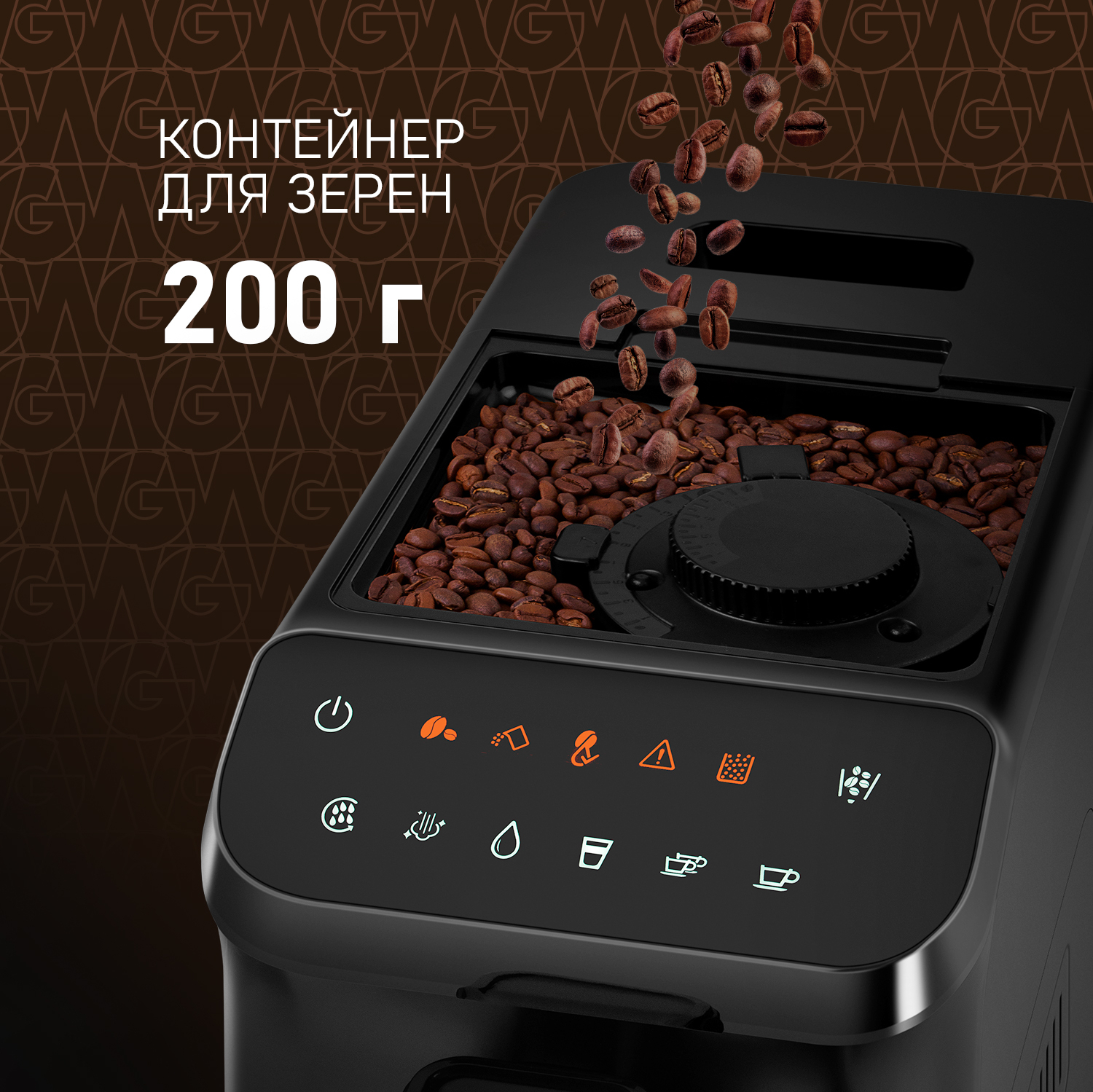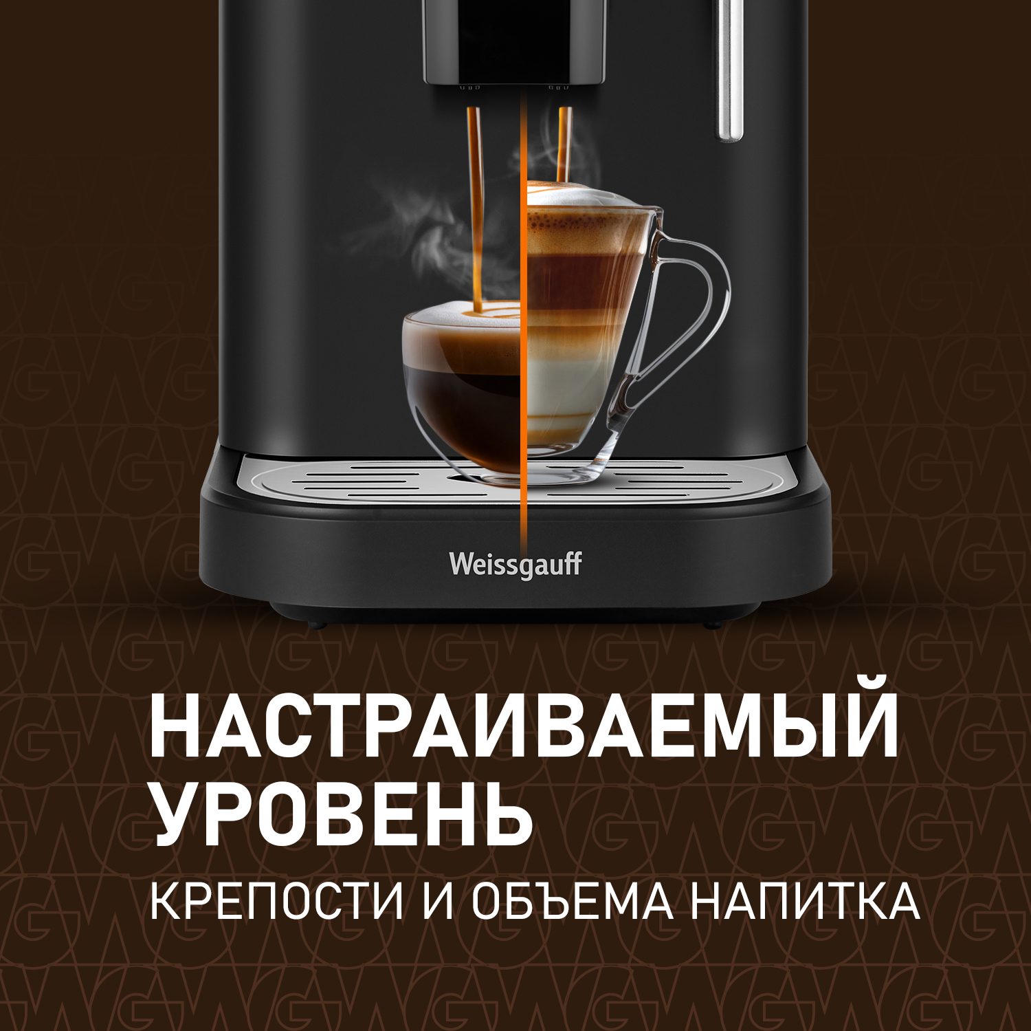 Компактная кофемашина от Weissgauff, выполненная в черном цвете, оснащенная контейнером для зерен на 200 грамм, обладающая сенсорной панелью управления, а также 5 заранее предустановленными программами для приготовления ароматного вкуснейшего кофе прямо на вашей кухне!